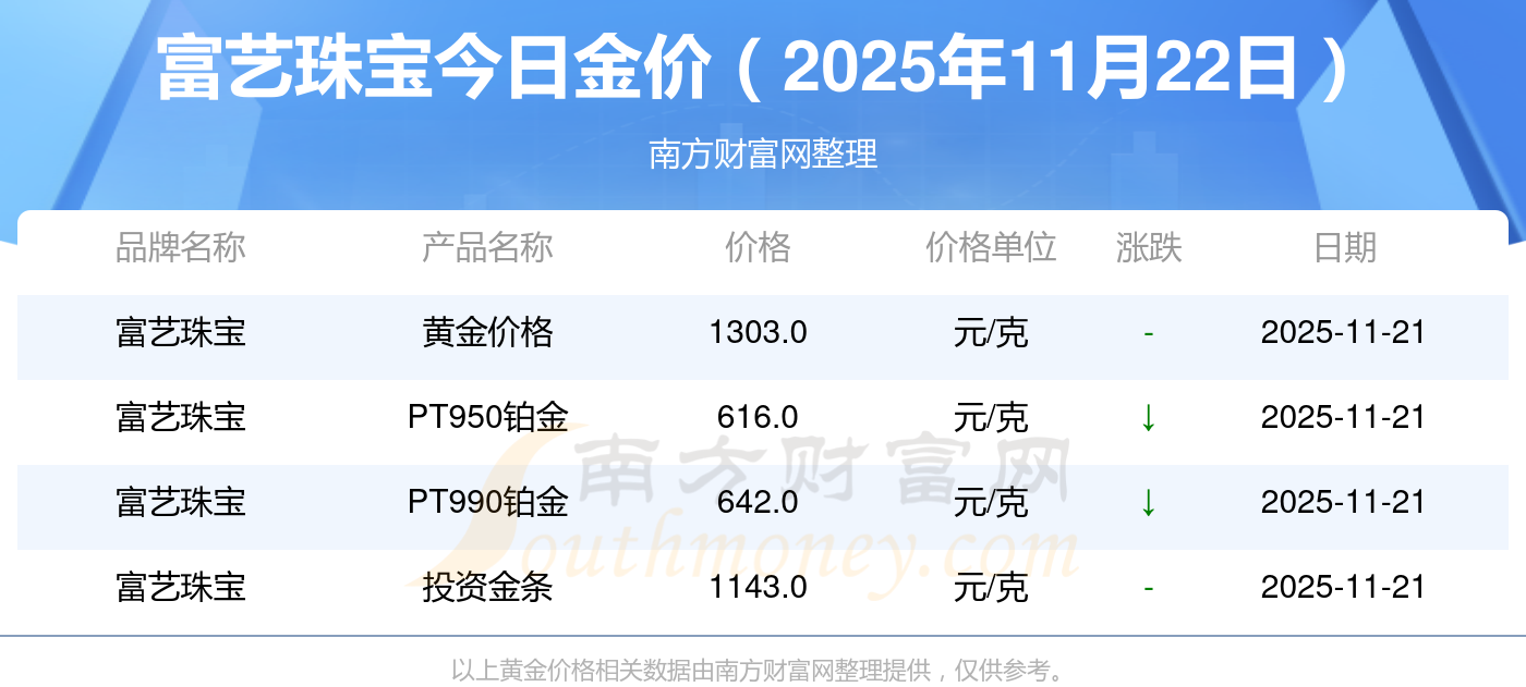 富艺珠宝黄金在今日的定价为多少?黄金价格1305.0元/克,铂金价格616.0元/克,饰品金价(内地)1305.0元/克,黄金饰品(香港)45110.0,铂金价格(香港)17570.0,金条价格(香港)40690.0,金条金价(内地)1143.0元/克,黄金价格1298.0元/克,铂金价格600.0元/克,足金价格1298.0元/克,黄金价格1266.0元/克。