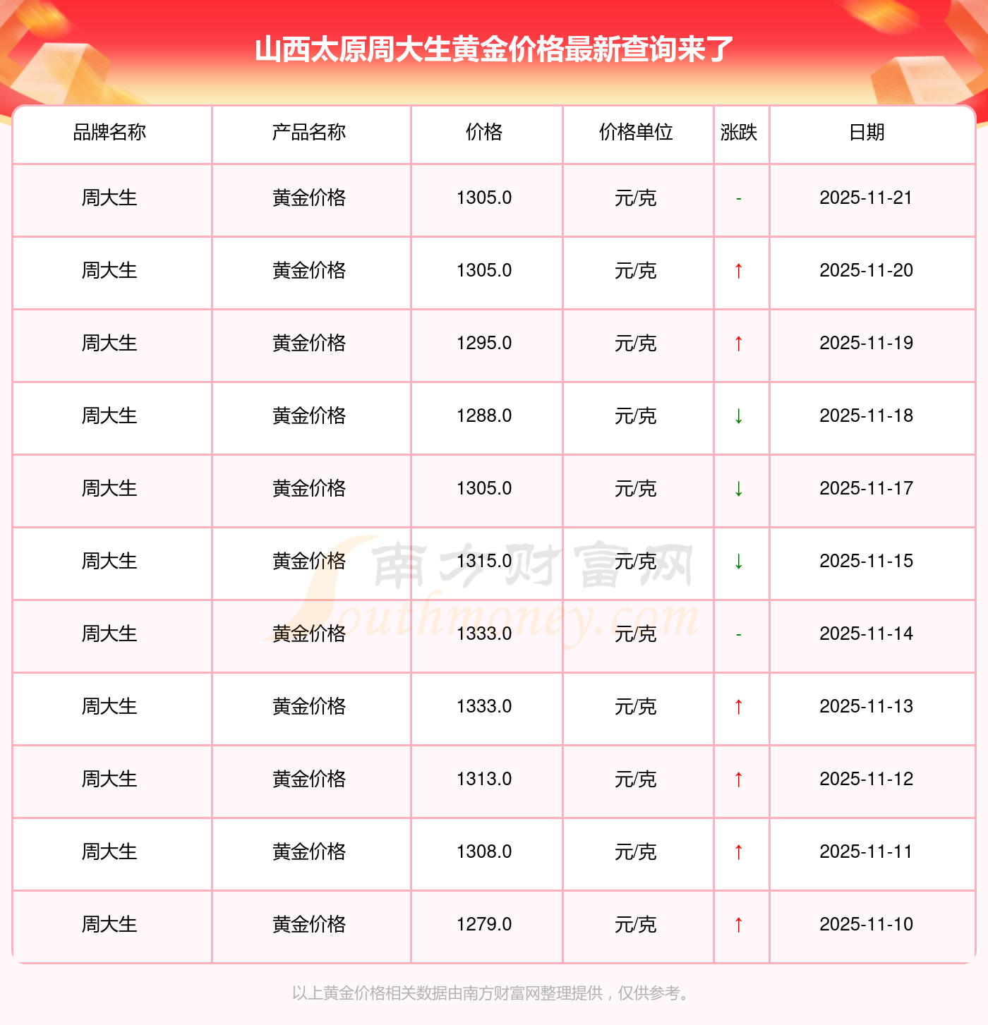 2025年11月22日,山西太原周大生所售黄金价格,其价格设定为 1305.0元/克。