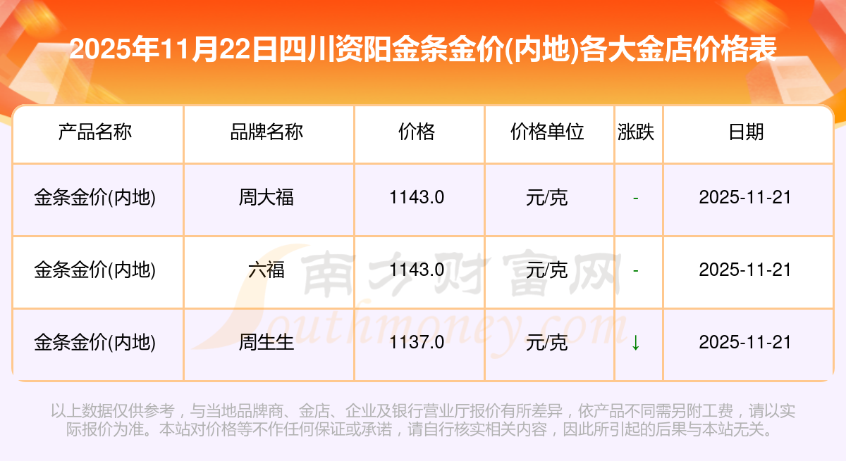 2025年11月22日四川资阳各大金店金条金价(内地)最新价格查询来了:周大福1305.0元/克,周大福616.0元/克,周大福1305.0元/克,周大福45110.0,周大福17570.0,周大福40690.0,周大福1143.0元/克,老凤祥1298.0元/克,老凤祥600.0元/克,老凤祥1298.0元/克,周六福1266.0元/克。