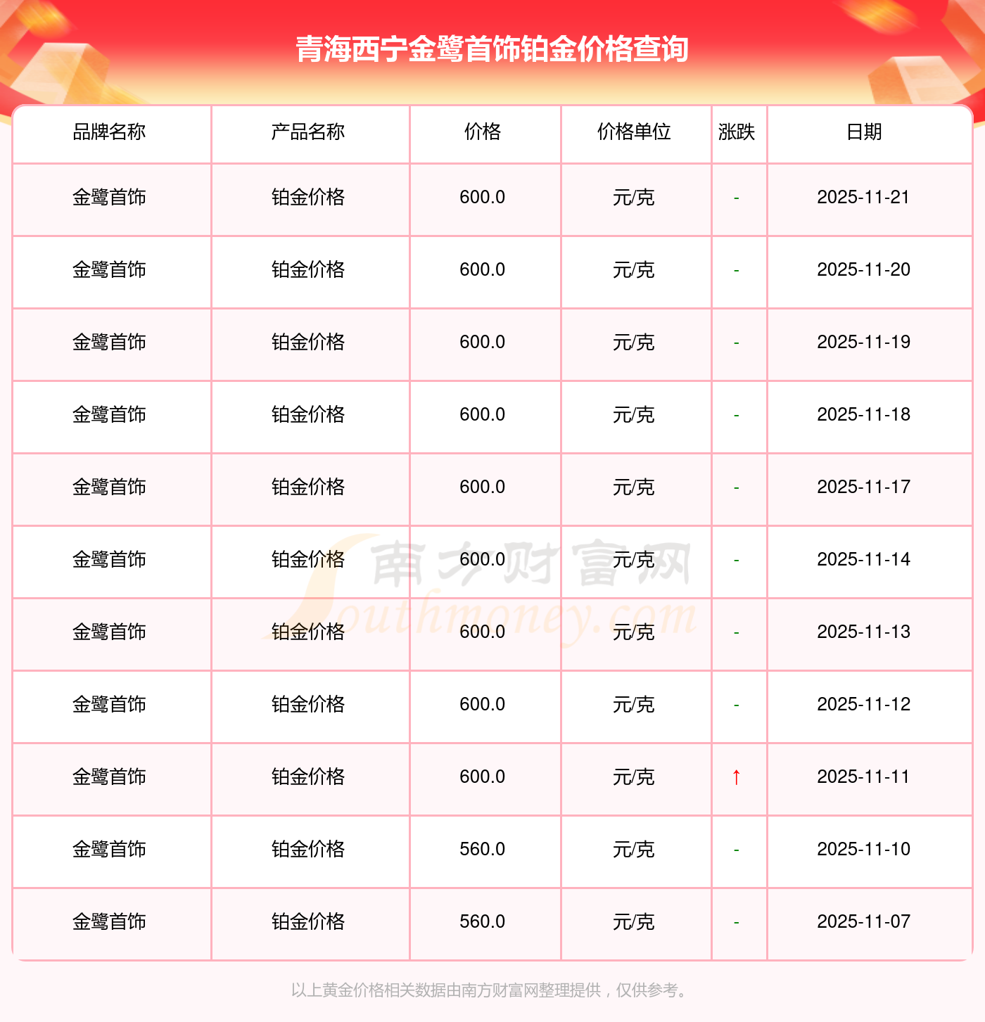 今日青海西宁金鹭首饰铂金价格为600.0元/克。