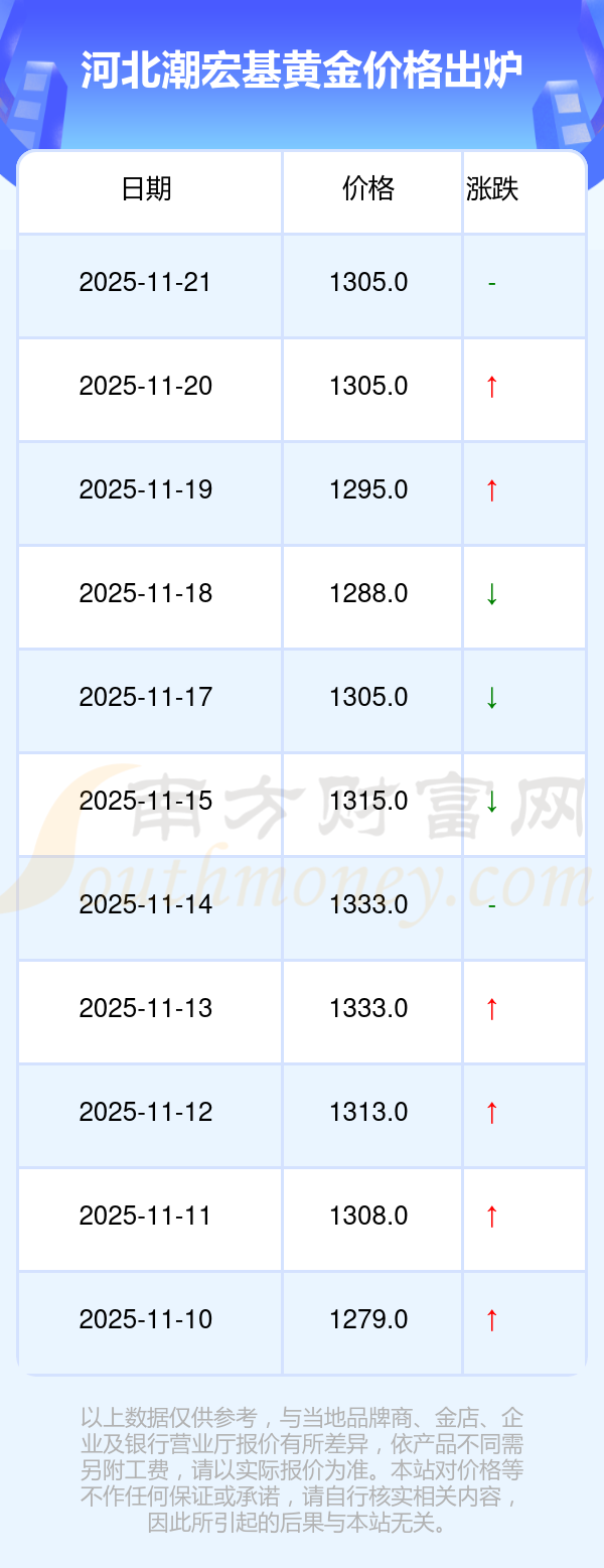 今日(2025年11月22日)河北潮宏基黄金价格最新价格为1305.0元/克。