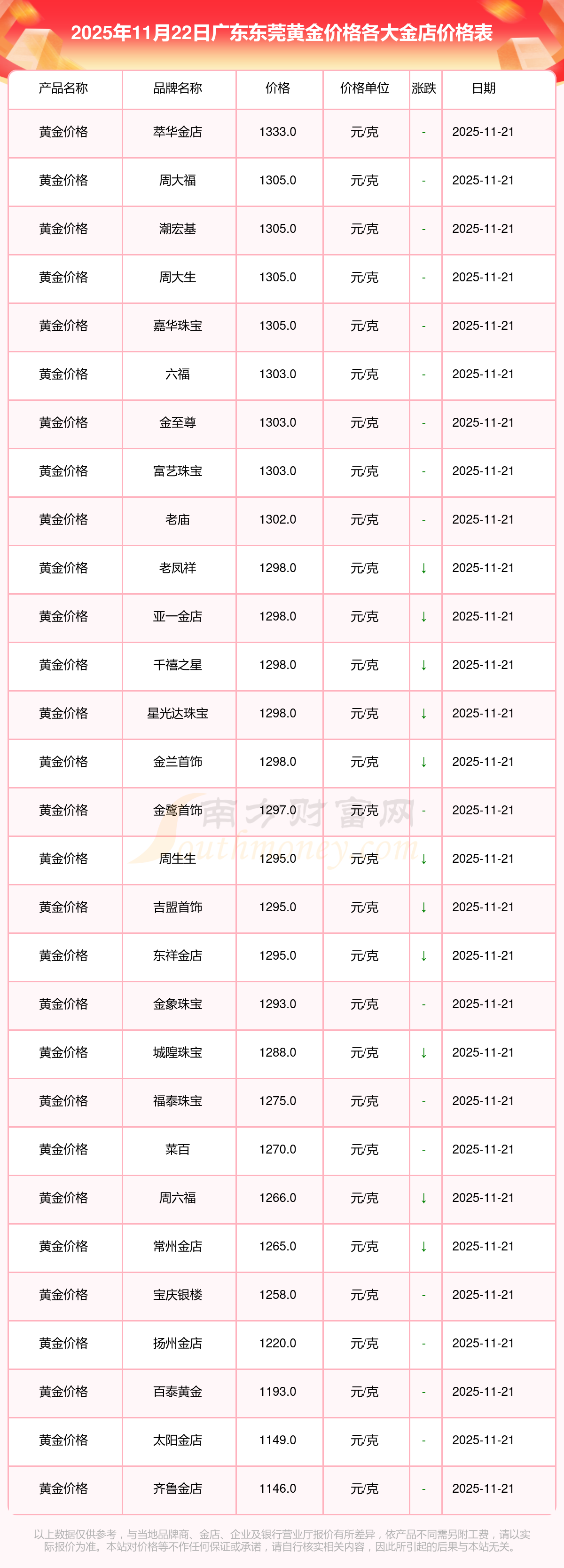 2025年11月22日广东东莞各大金店黄金价格最新价格:周大福1305.0元/克,周大福616.0元/克,周大福1305.0元/克,周大福45110.0,周大福17570.0,周大福40690.0,周大福1143.0元/克,老凤祥1298.0元/克,老凤祥600.0元/克,老凤祥1298.0元/克,周六福1266.0元/克。