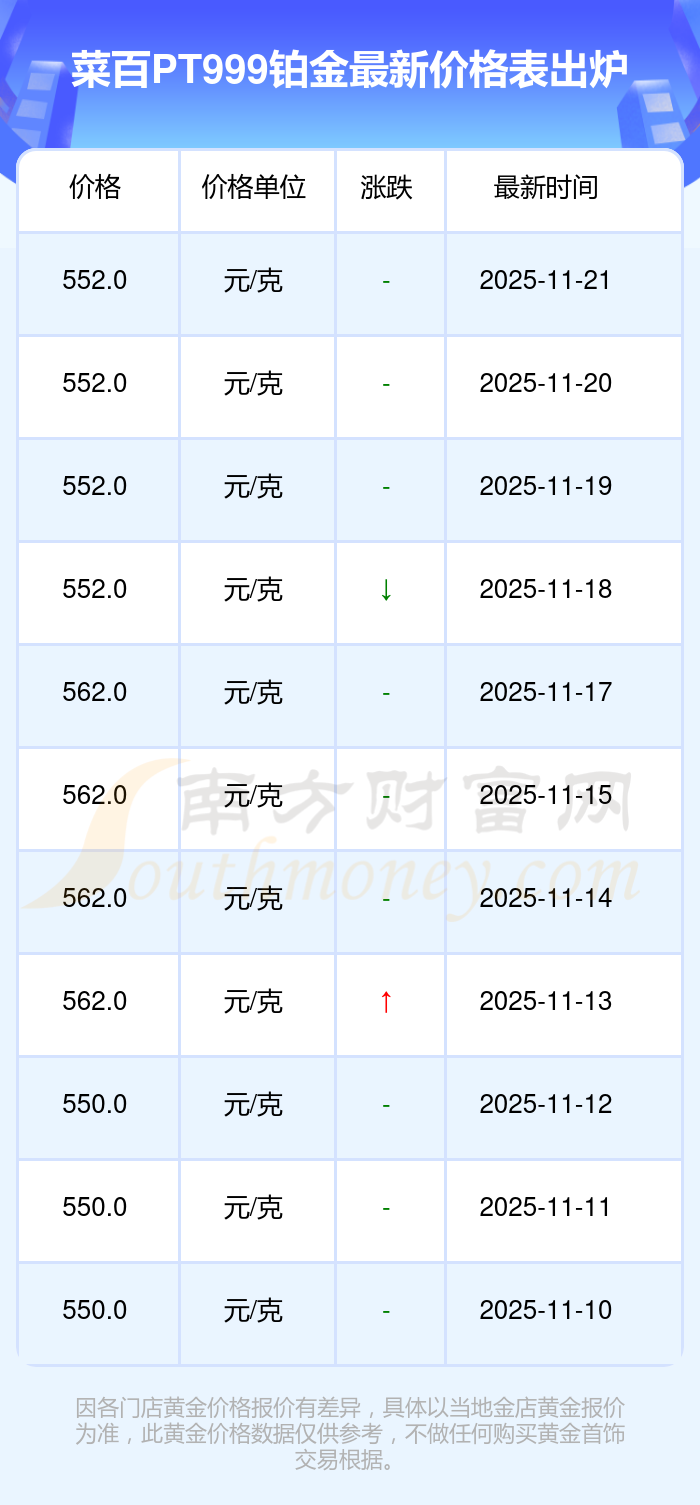 菜百 PT999铂金在今日的最新价格显示为552.0元/克。