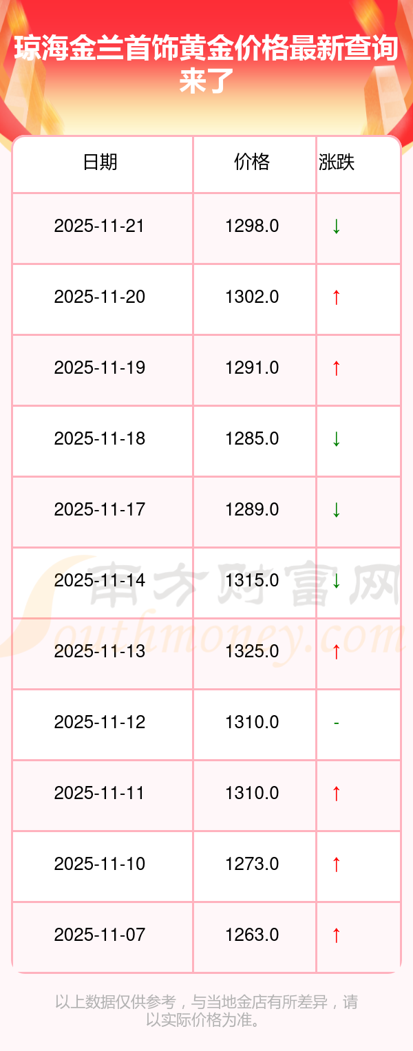 2025年11月22日,今日琼海金兰首饰黄金价格:1298.0元/克。