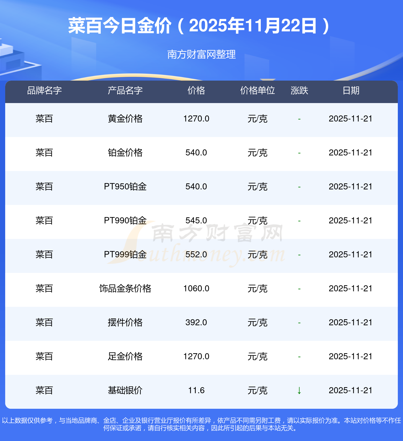 2025年11月22日周大福、周大福、周大福、周大福、周大福、周大福、周大福、老凤祥、老凤祥、老凤祥、周六福等各大金店品牌黄金价格最新价格如下:周大福黄金价格1305.0元/克,周大福铂金价格616.0元/克,周大福饰品金价(内地)1305.0元/克,周大福黄金饰品(香港)45110.0,周大福铂金价格(香港)17570.0,周大福金条价格(香港)40690.0,周大福金条金价(内地)1143.0元/克,老凤祥黄金价格1298.0元/克,老凤祥铂金价格600.0元/克,老凤祥足金价格1298.0元/克,周六福黄金价格1266.0元/克。