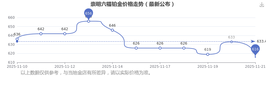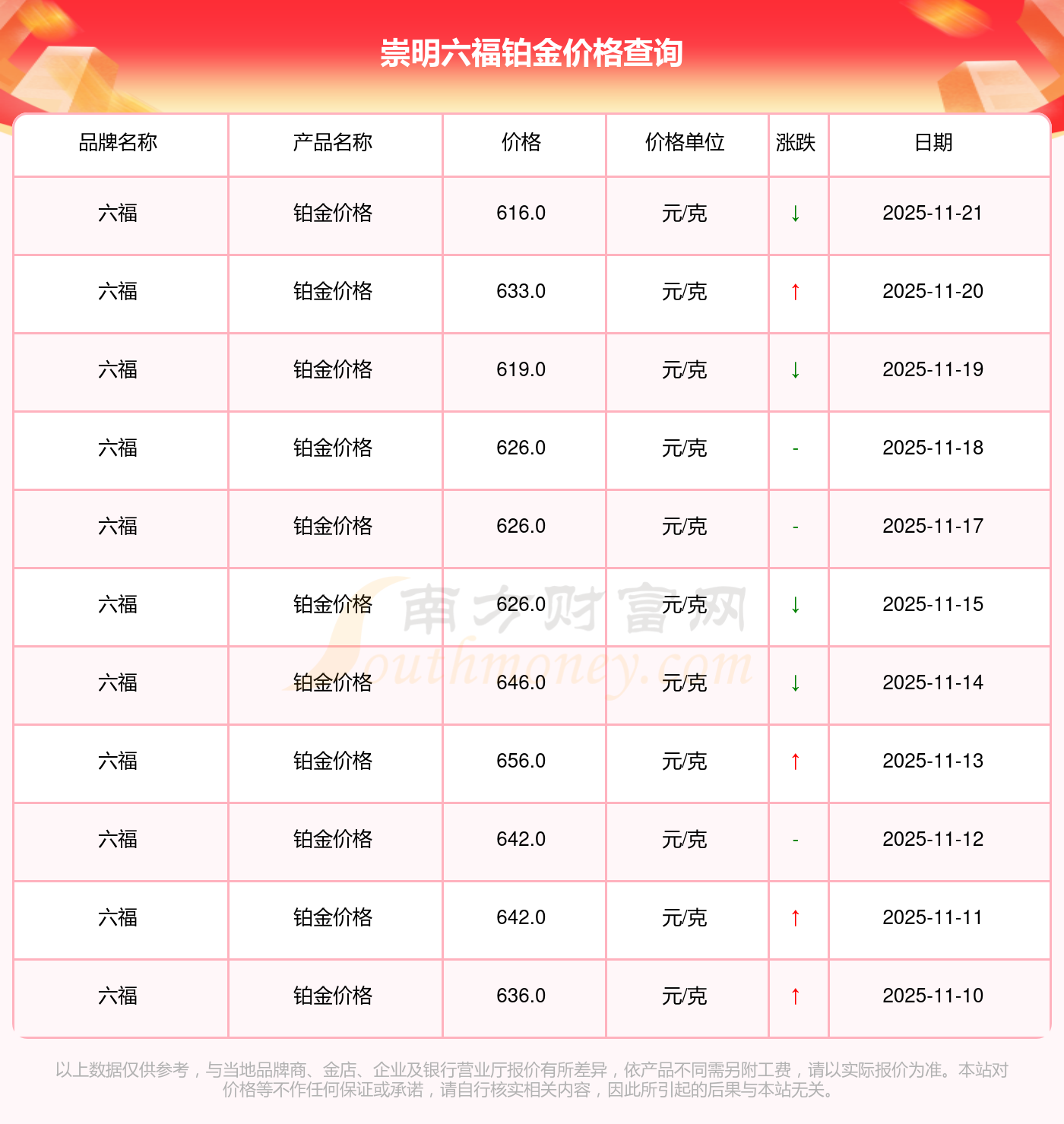 今日(2025年11月22日)崇明六福铂金价格最新价格为616.0元/克。