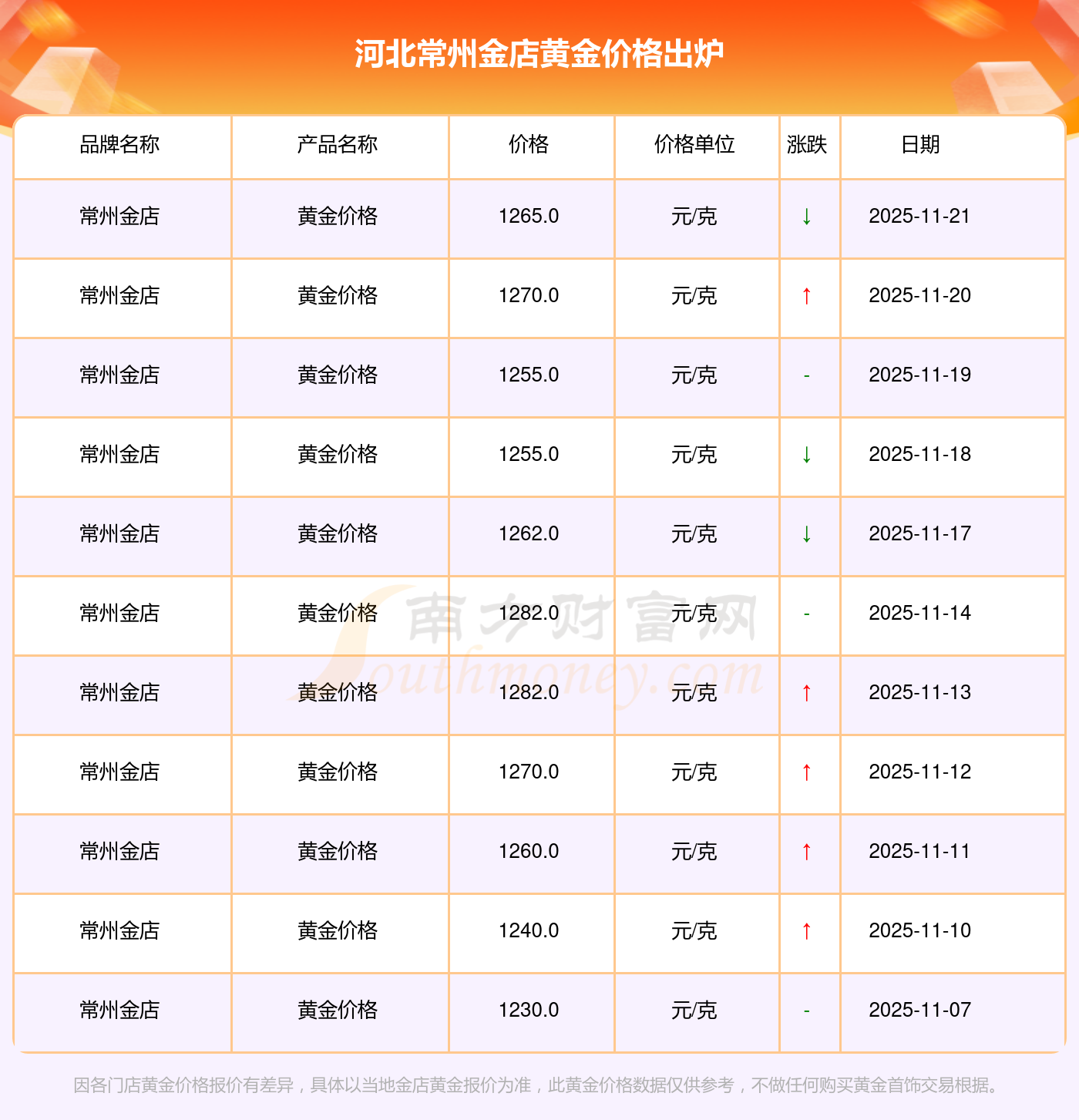 一、河北常州金店黄金价格表来了