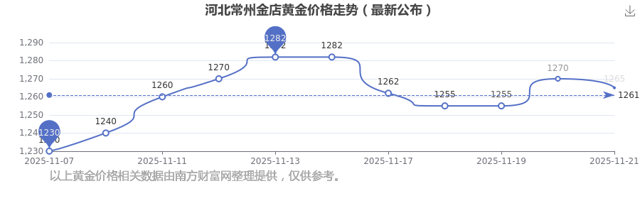 今日(2025年11月22日)河北常州金店黄金价格是1265.0元/克。