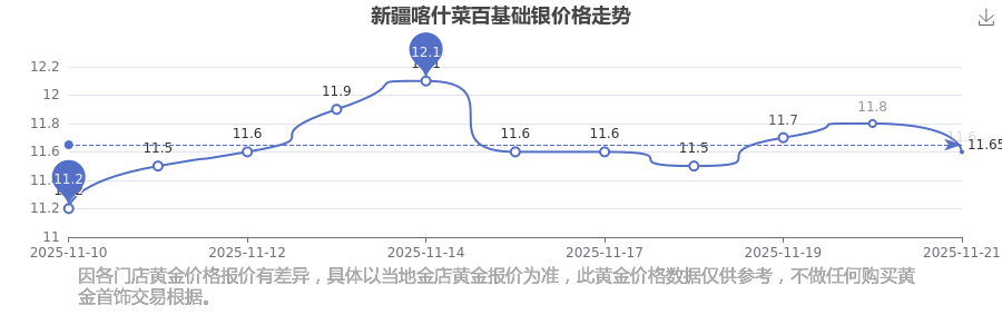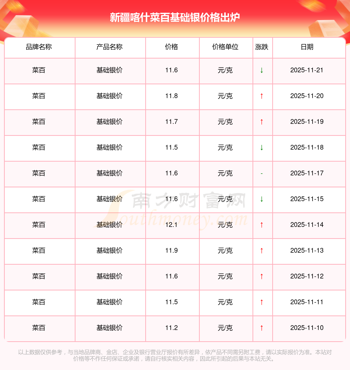 (2025年11月22日)新疆喀什菜百基础银价格现在为11.6元/克。