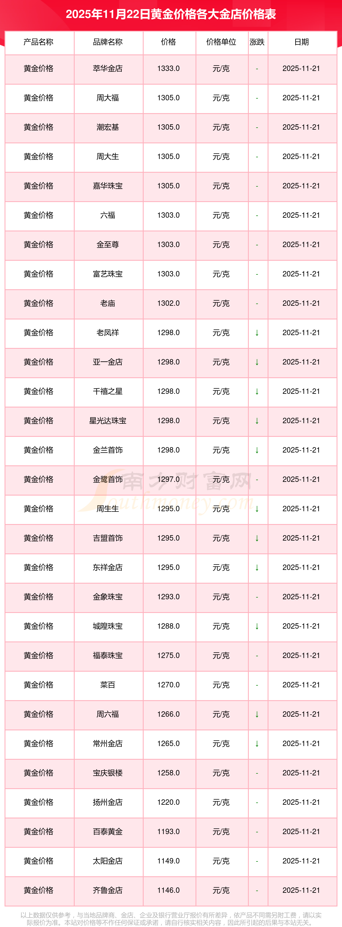 2025年11月22日各大金店黄金价格最新价格:周大福1305.0元/克,周大福616.0元/克,周大福1305.0元/克,周大福45110.0,周大福17570.0,周大福40690.0,周大福1143.0元/克,老凤祥1298.0元/克,老凤祥600.0元/克,老凤祥1298.0元/克,周六福1266.0元/克。