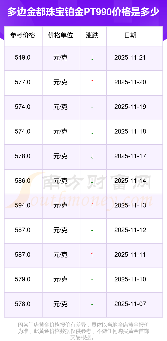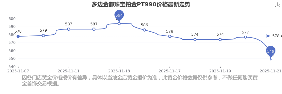 今日多边金都珠宝 铂金PT990最新的市场标价为549.0元/克。