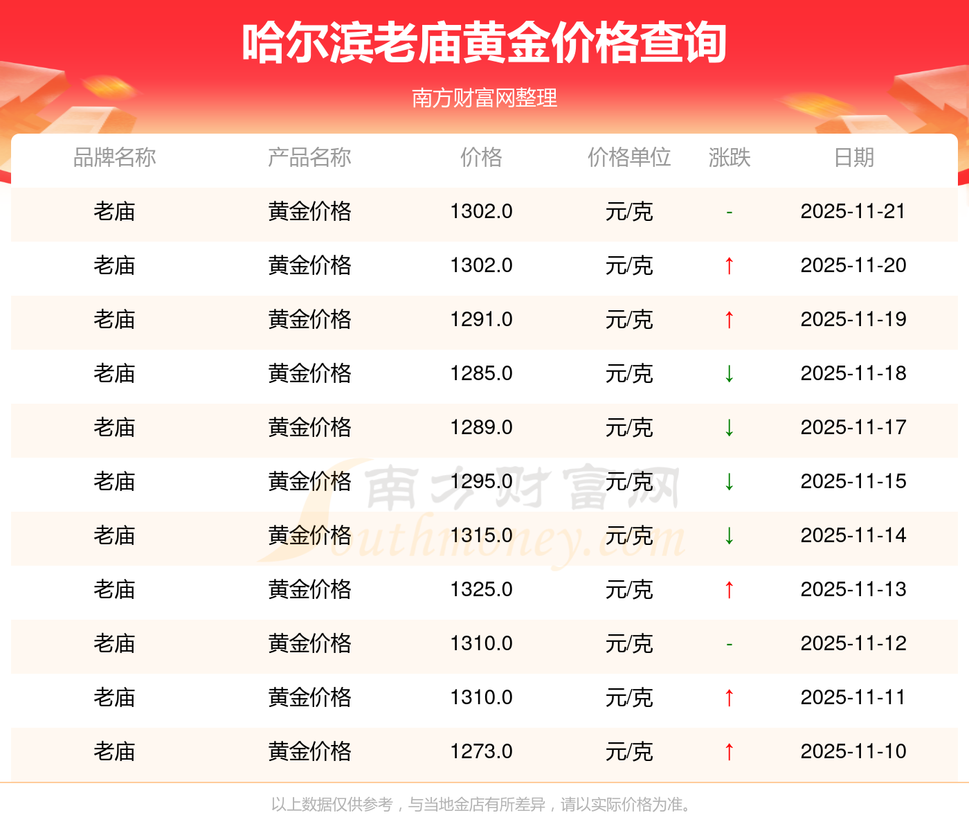今日哈尔滨老庙黄金价格公布今天,黄金的克价是多少2025年11月22日哈尔滨老庙黄金价格:1302.0元/克。
