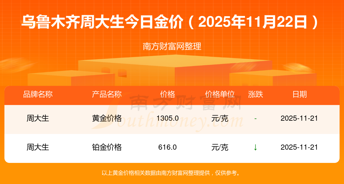 想查询今日黄金价格,当下黄金一克具体售价几何?2025年11月22日乌鲁木齐周大生今日价格:黄金价格1305.0元/克,铂金价格616.0元/克,饰品金价(内地)1305.0元/克,黄金饰品(香港)45110.0,铂金价格(香港)17570.0,金条价格(香港)40690.0,金条金价(内地)1143.0元/克,黄金价格1298.0元/克,铂金价格600.0元/克,足金价格1298.0元/克,黄金价格1266.0元/克。