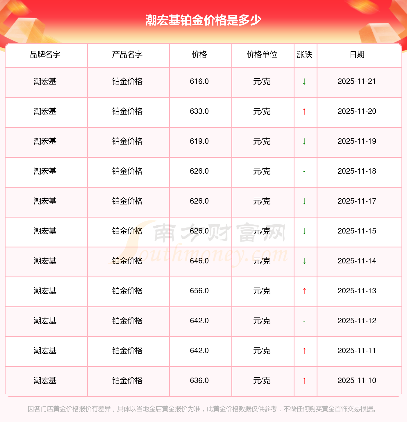 今日潮宏基铂金价格最新查询:616.0元/克。
