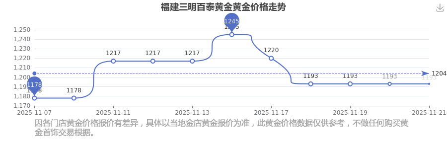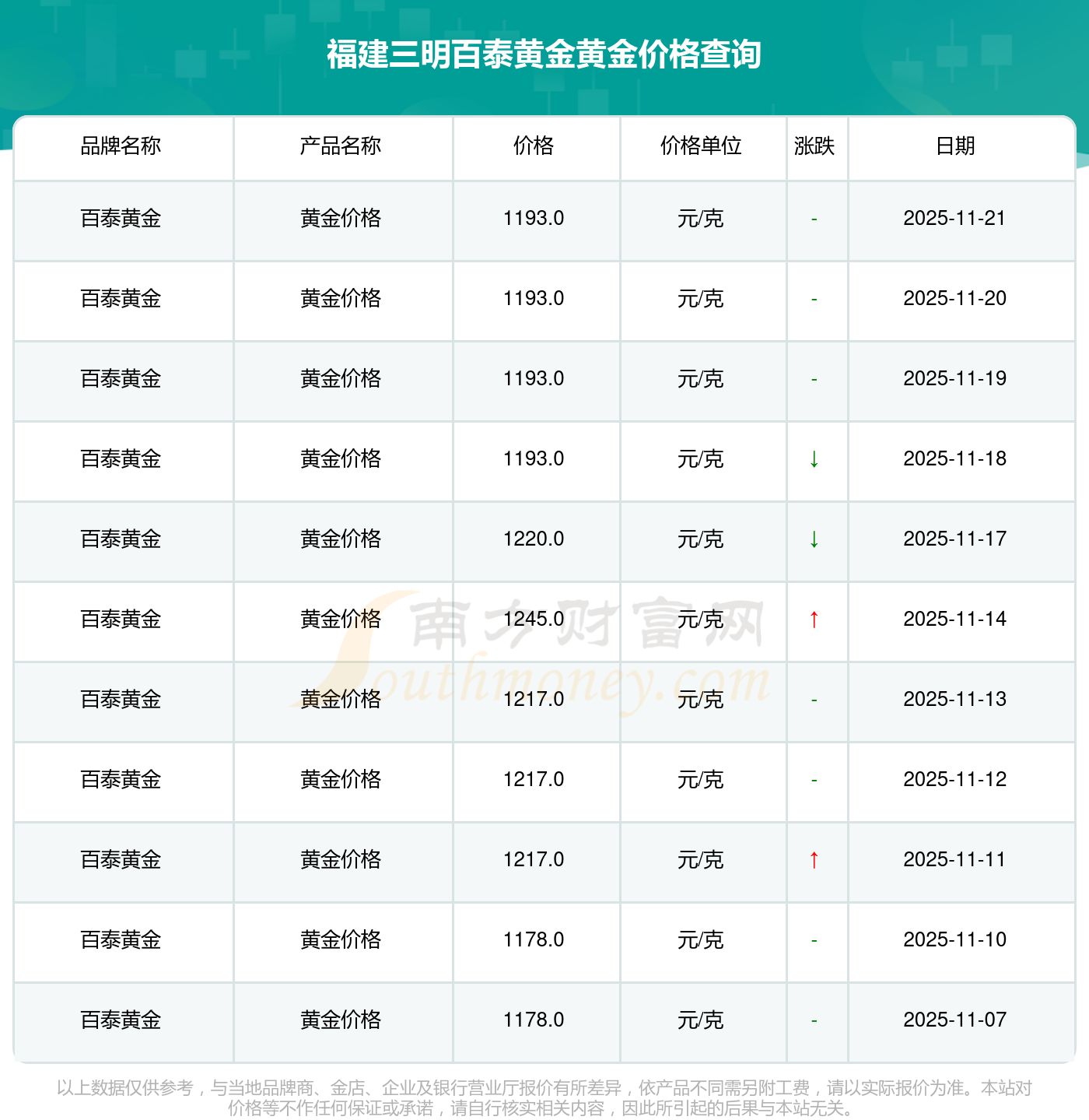 2025年11月22日,福建三明百泰黄金黄金价格每克的价值量定格在1193.0元/克。