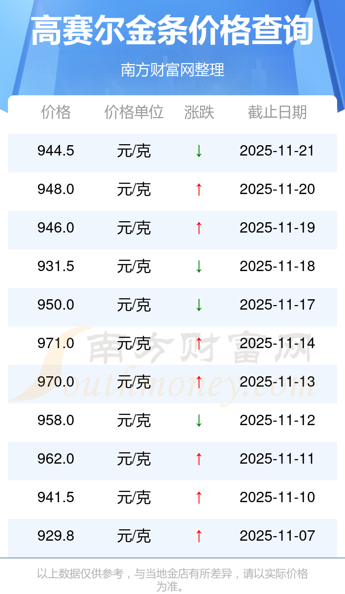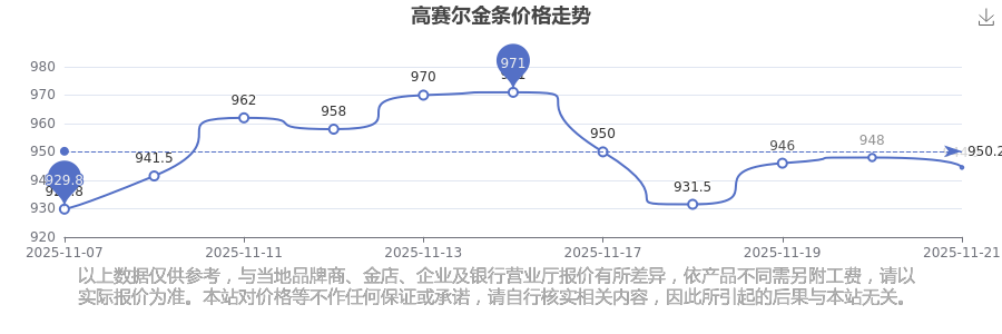 今日(2025年11月22日)高赛尔金条价格:944.5元/克。