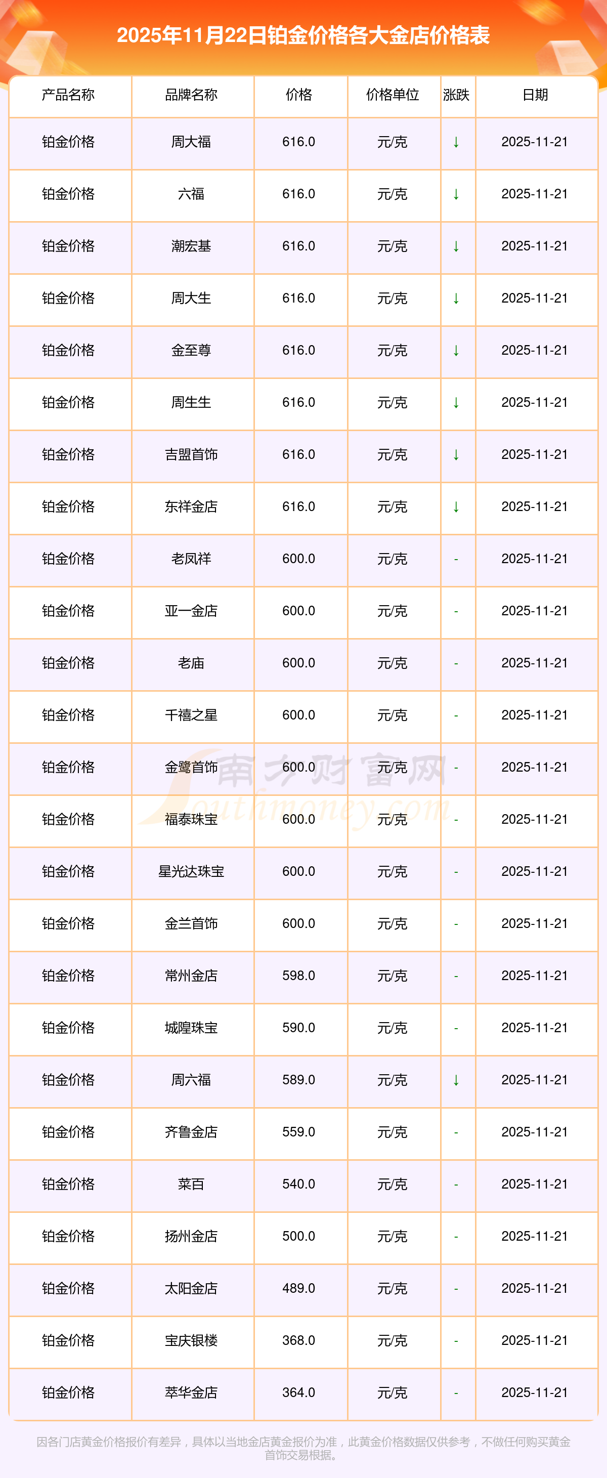 2025年11月22日,周大福、周大福、周大福、周大福、周大福、周大福、周大福、老凤祥、老凤祥、老凤祥、周六福等各大金店品牌铂金价格今日价格如下:周大福1305.0元/克、周大福616.0元/克、周大福1305.0元/克、周大福45110.0、周大福17570.0、周大福40690.0、周大福1143.0元/克、老凤祥1298.0元/克、老凤祥600.0元/克、老凤祥1298.0元/克、周六福1266.0元/克。