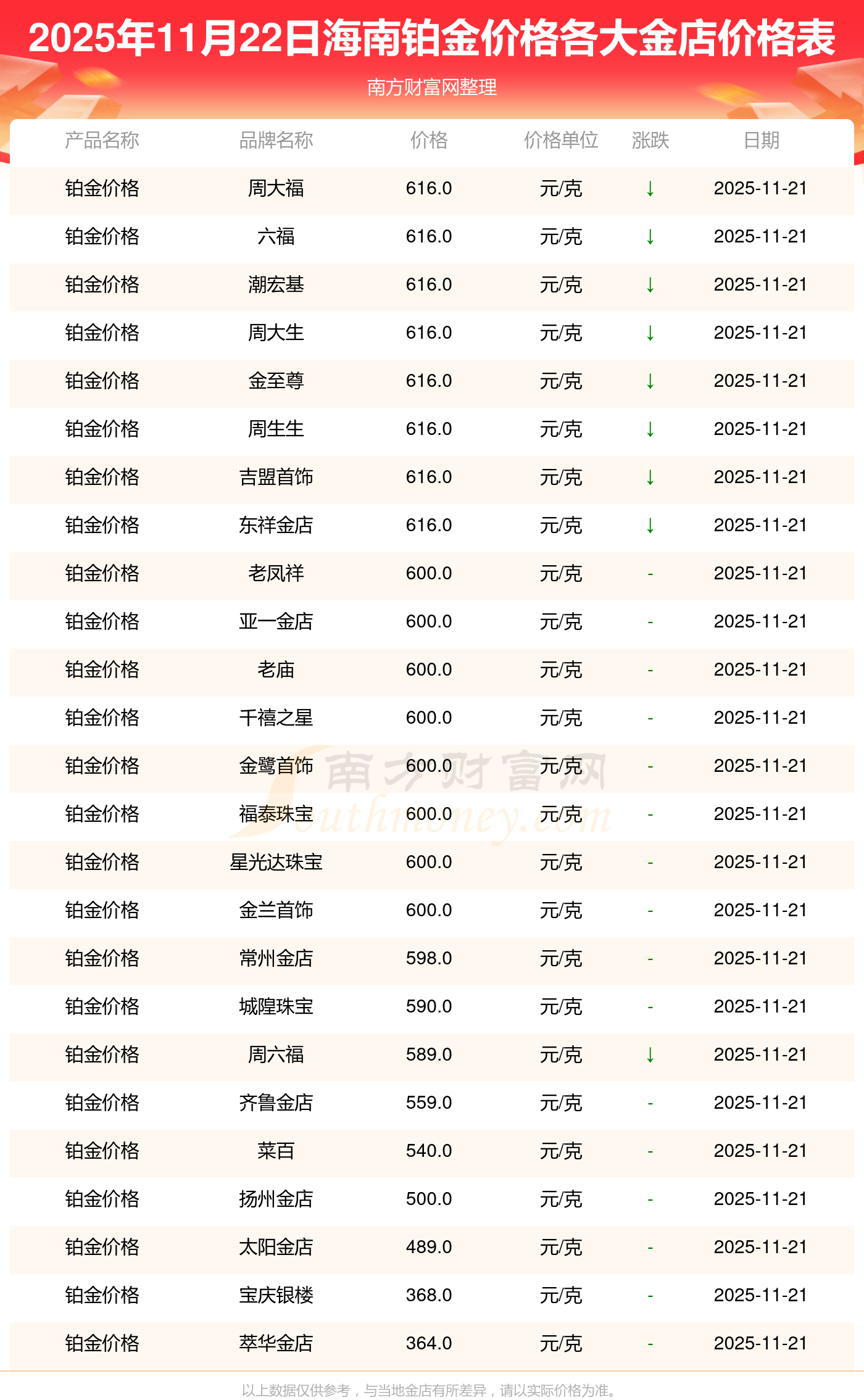 一、海南各金店铂金价格表来了