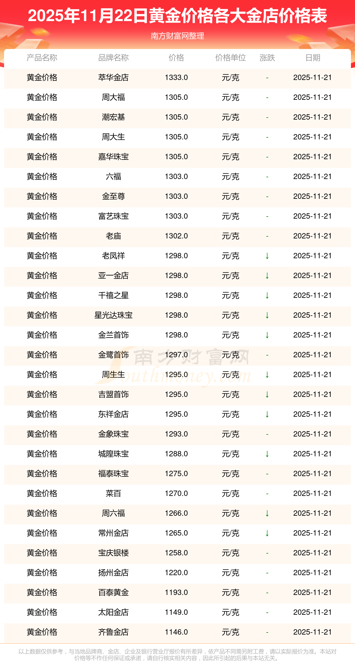 2025年11月22日各大金店黄金价格最新价格:周大福1305.0元/克,周大福616.0元/克,周大福1305.0元/克,周大福45110.0,周大福17570.0,周大福40690.0,周大福1143.0元/克,老凤祥1298.0元/克,老凤祥600.0元/克,老凤祥1298.0元/克,周六福1266.0元/克。