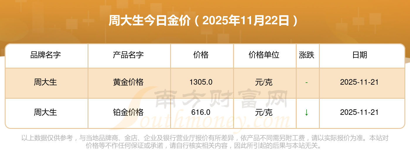 2025年11月22日各大金店黄金价格最新价格:周大福1305.0元/克,周大福616.0元/克,周大福1305.0元/克,周大福45110.0,周大福17570.0,周大福40690.0,周大福1143.0元/克,老凤祥1298.0元/克,老凤祥600.0元/克,老凤祥1298.0元/克,周六福1266.0元/克。