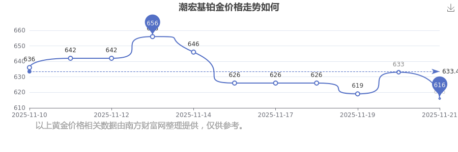 今日(2025年11月22日)潮宏基铂金价格是616.0元/克。
