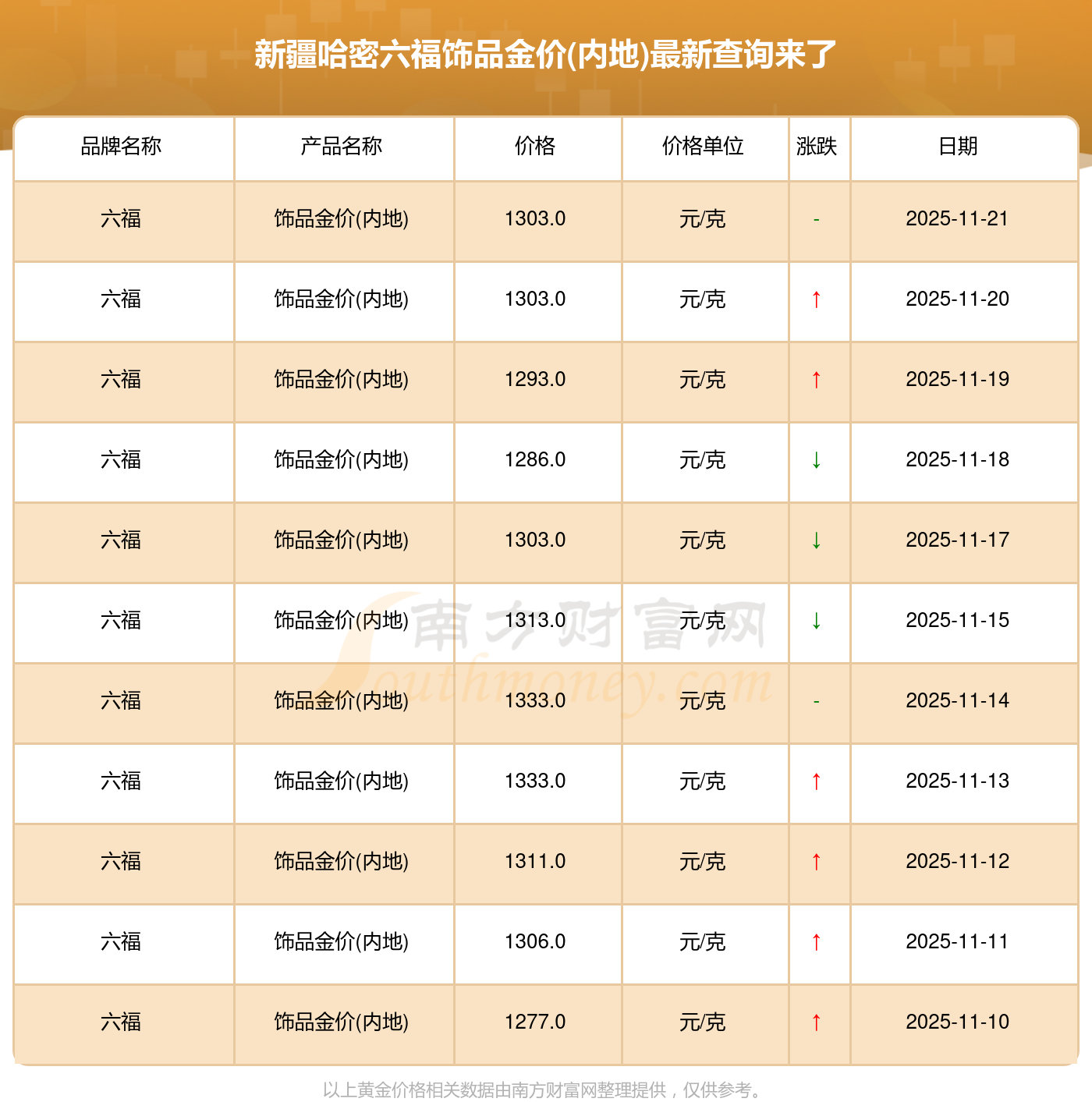 2025年11月22日新疆哈密六福饰品金价(内地)是1303.0元/克。