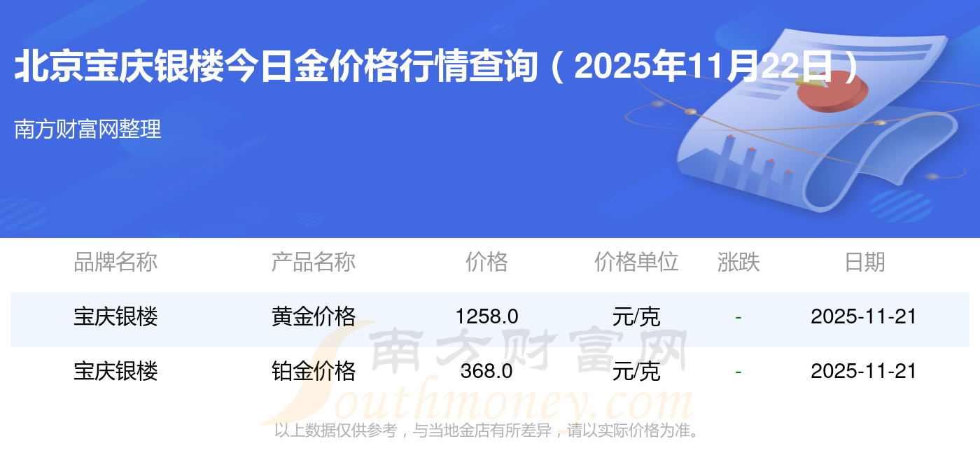 今日黄金价格具体是多少?现在一克黄金卖多少钱?2025年11月22日北京宝庆银楼黄金按克计价,现在多少钱一克?黄金价格1305.0元/克,铂金价格616.0元/克,饰品金价(内地)1305.0元/克,黄金饰品(香港)45110.0,铂金价格(香港)17570.0,金条价格(香港)40690.0,金条金价(内地)1143.0元/克,黄金价格1298.0元/克,铂金价格600.0元/克,足金价格1298.0元/克,黄金价格1266.0元/克。