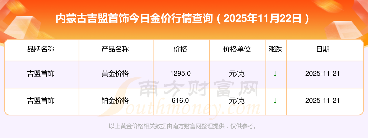 今日黄金价格查询_现在金价黄金一克多少钱,黄金价格是多少钱一克?2025年11月22日内蒙古吉盟首饰金价查询:黄金价格1305.0元/克,铂金价格616.0元/克,饰品金价(内地)1305.0元/克,黄金饰品(香港)45110.0,铂金价格(香港)17570.0,金条价格(香港)40690.0,金条金价(内地)1143.0元/克,黄金价格1298.0元/克,铂金价格600.0元/克,足金价格1298.0元/克,黄金价格1266.0元/克。