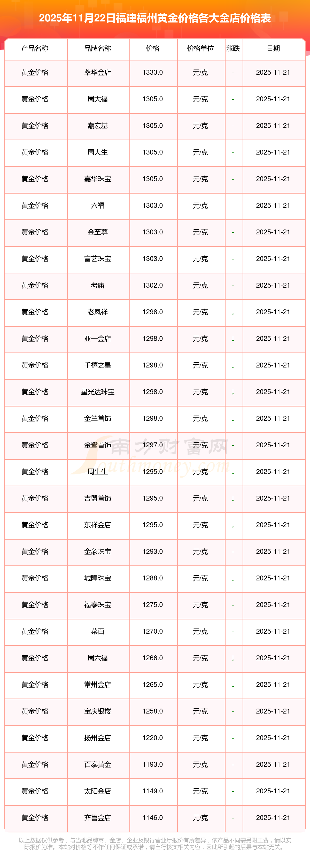 2025年11月22日,福建福州周大福、周大福、周大福、周大福、周大福、周大福、周大福、老凤祥、老凤祥、老凤祥、周六福等各大金店品牌黄金价格今日价格行情最新来了:周大福1305.0元/克、周大福616.0元/克、周大福1305.0元/克、周大福45110.0、周大福17570.0、周大福40690.0、周大福1143.0元/克、老凤祥1298.0元/克、老凤祥600.0元/克、老凤祥1298.0元/克、周六福1266.0元/克。
