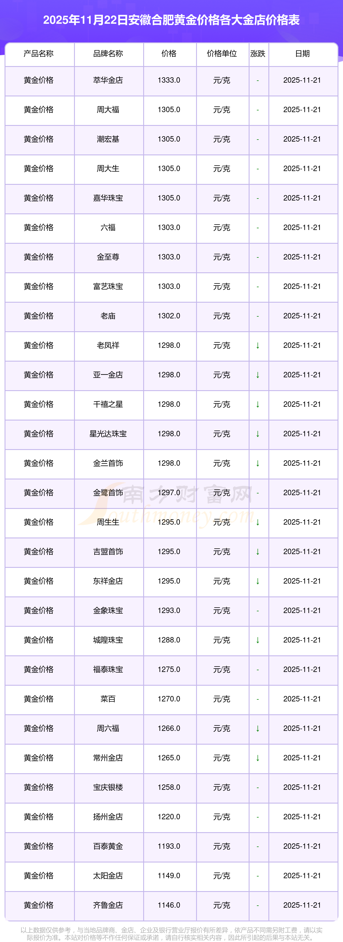 2025年11月22日安徽合肥周大福、周大福、周大福、周大福、周大福、周大福、周大福、老凤祥、老凤祥、老凤祥、周六福等各大金店品牌黄金价格最新价格如下:周大福黄金价格1305.0元/克,周大福铂金价格616.0元/克,周大福饰品金价(内地)1305.0元/克,周大福黄金饰品(香港)45110.0,周大福铂金价格(香港)17570.0,周大福金条价格(香港)40690.0,周大福金条金价(内地)1143.0元/克,老凤祥黄金价格1298.0元/克,老凤祥铂金价格600.0元/克,老凤祥足金价格1298.0元/克,周六福黄金价格1266.0元/克。