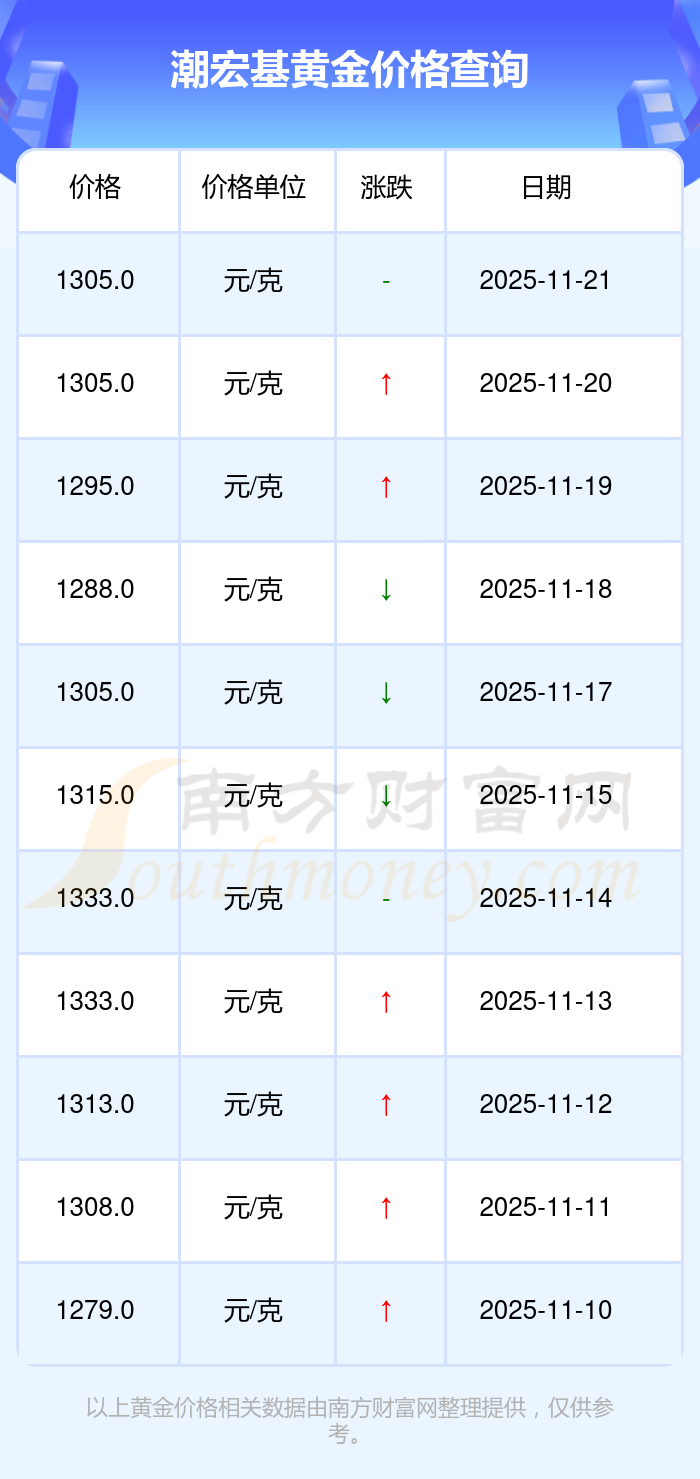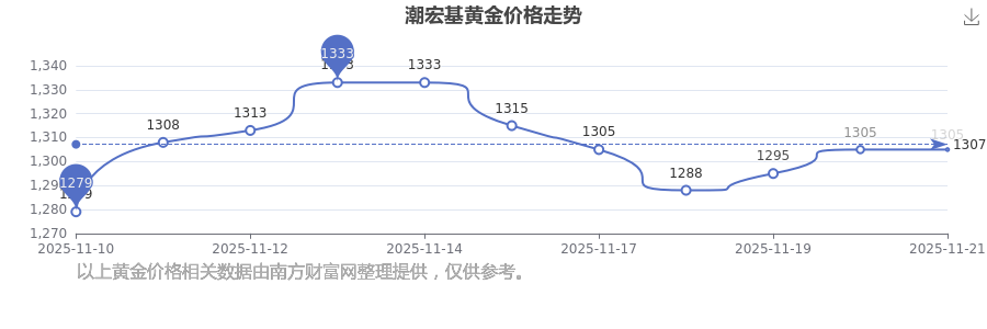 今天黄金价格行情如何?现在一克黄金的售价是多少?通常情况下黄金每一克的价格大概是多少呢?2025年11月22日潮宏基黄金价格最新是1305.0元/克。