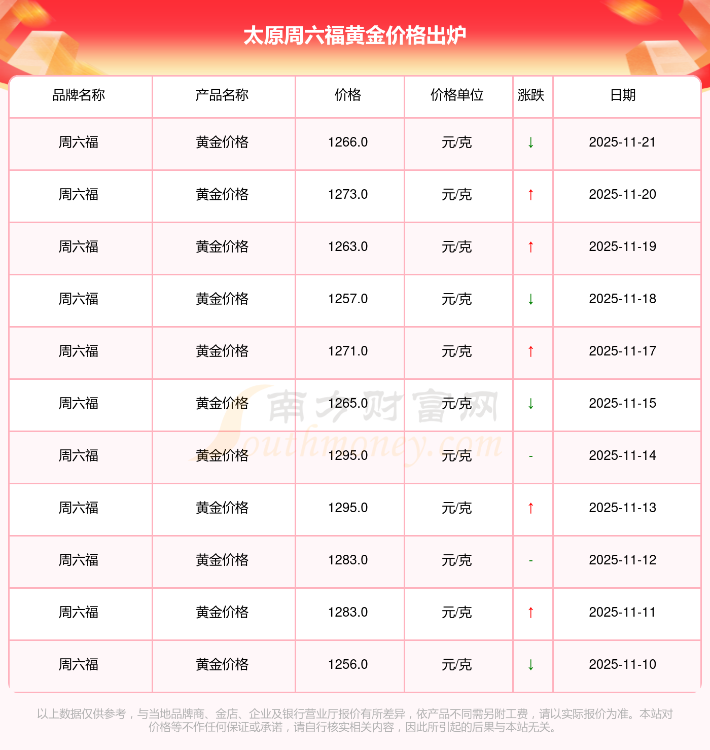 今日太原周六福黄金价格公布今日黄金每克的售卖价格为多少太原周六福黄金价格在 2025年11月22日,其市场价格为 1266.0元/克。