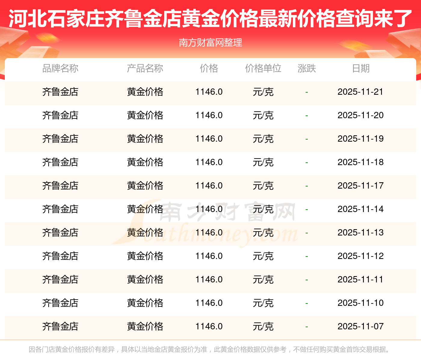 今日(2025年11月22日),河北石家庄齐鲁金店黄金价格的价格是1146.0元/克。
