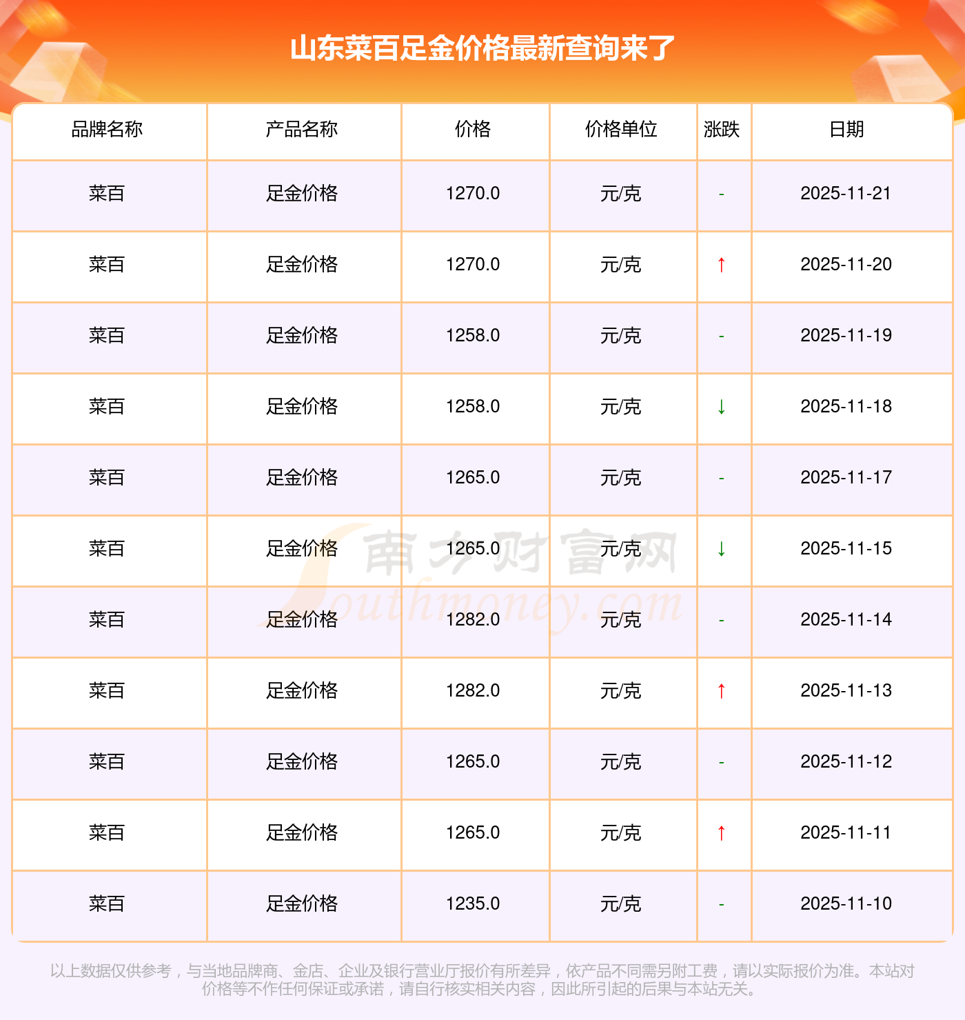 2025年11月22日各大金店足金价格最新价格:周大福1305.0元/克,周大福616.0元/克,周大福1305.0元/克,周大福45110.0,周大福17570.0,周大福40690.0,周大福1143.0元/克,老凤祥1298.0元/克,老凤祥600.0元/克,老凤祥1298.0元/克,周六福1266.0元/克。