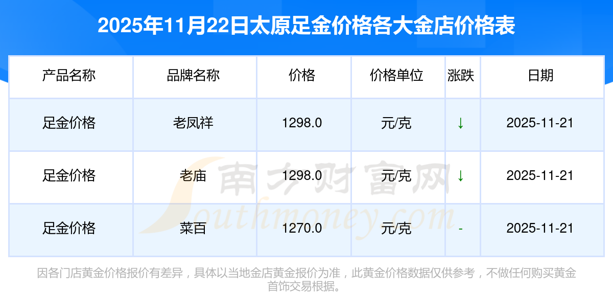 2025年11月22日太原周大福、周大福、周大福、周大福、周大福、周大福、周大福、老凤祥、老凤祥、老凤祥、周六福等各大金店品牌足金价格最新价格行情来了,如下:周大福黄金价格1305.0元/克,周大福铂金价格616.0元/克,周大福饰品金价(内地)1305.0元/克,周大福黄金饰品(香港)45110.0,周大福铂金价格(香港)17570.0,周大福金条价格(香港)40690.0,周大福金条金价(内地)1143.0元/克,老凤祥黄金价格1298.0元/克,老凤祥铂金价格600.0元/克,老凤祥足金价格1298.0元/克,周六福黄金价格1266.0元/克。