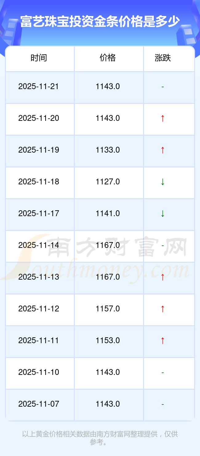 今日富艺珠宝投资金条价格为1143.0元/克。