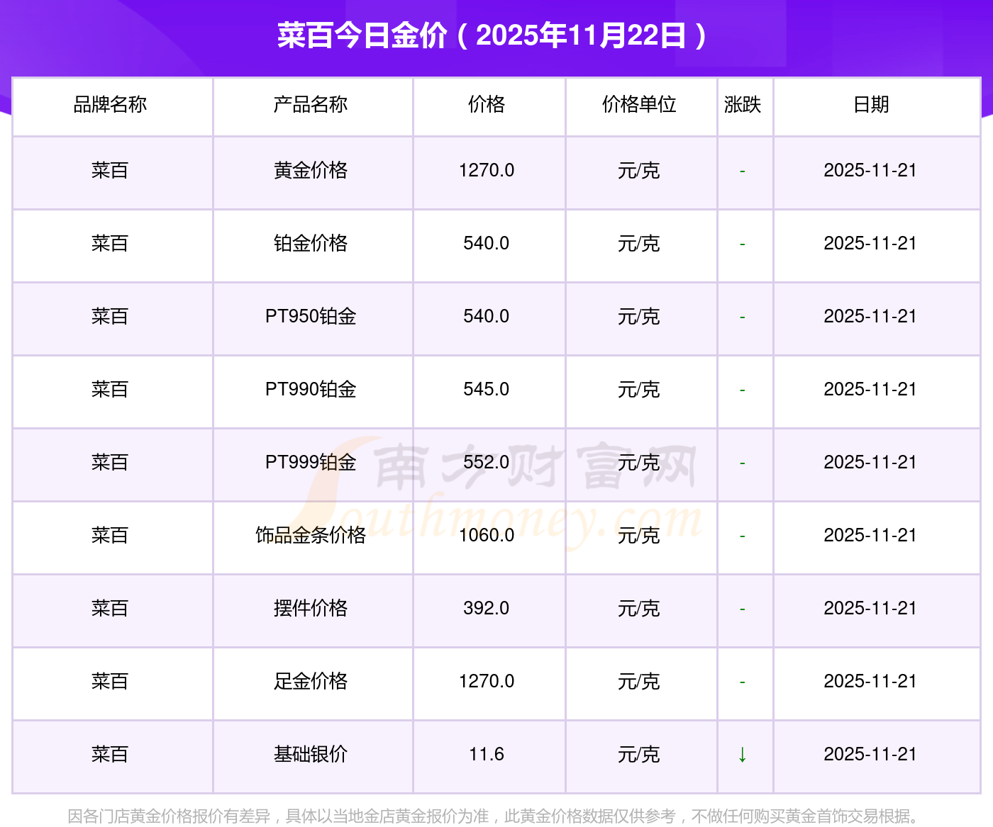 2025年11月22日各大金店PT990铂金最新价格:周大福1305.0元/克,周大福616.0元/克,周大福1305.0元/克,周大福45110.0,周大福17570.0,周大福40690.0,周大福1143.0元/克,老凤祥1298.0元/克,老凤祥600.0元/克,老凤祥1298.0元/克,周六福1266.0元/克。
