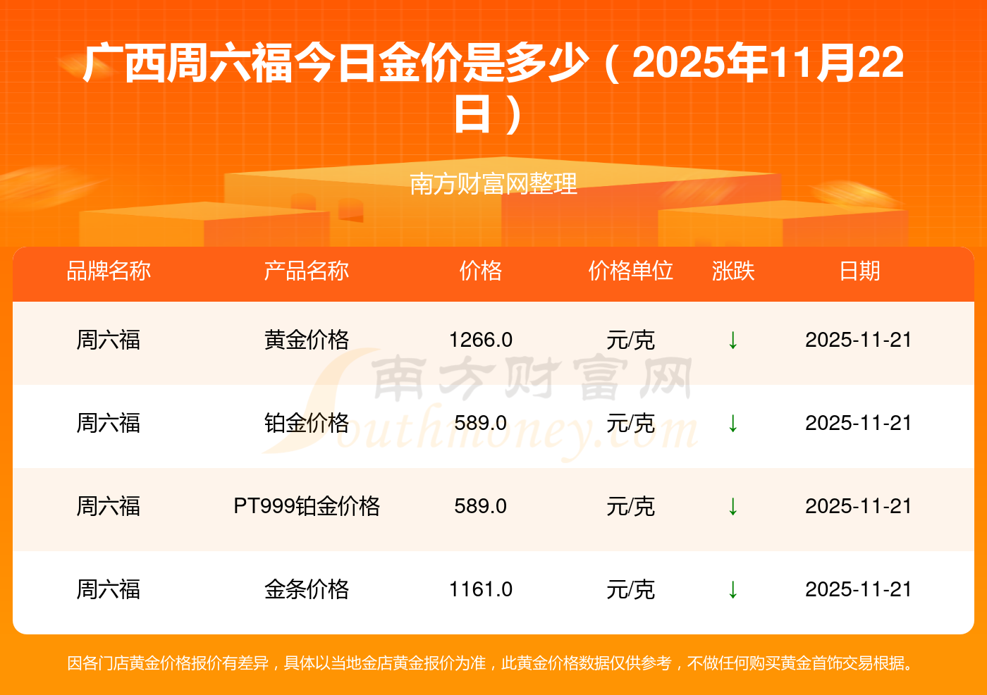今日黄金价格具体多少?当下每克黄金值多少钱呢? 2025年11月22日广西周六福现在黄金一克要多少钱:黄金价格1305.0元/克,铂金价格616.0元/克,饰品金价(内地)1305.0元/克,黄金饰品(香港)45110.0,铂金价格(香港)17570.0,金条价格(香港)40690.0,金条金价(内地)1143.0元/克,黄金价格1298.0元/克,铂金价格600.0元/克,足金价格1298.0元/克,黄金价格1266.0元/克。