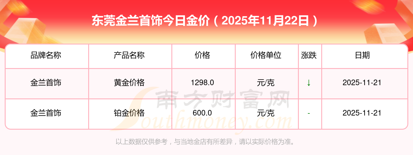 想查询当下黄金价格,今日黄金一克的价格是多少呢?2025年11月22日东莞金兰首饰金价查询:黄金价格1305.0元/克,铂金价格616.0元/克,饰品金价(内地)1305.0元/克,黄金饰品(香港)45110.0,铂金价格(香港)17570.0,金条价格(香港)40690.0,金条金价(内地)1143.0元/克,黄金价格1298.0元/克,铂金价格600.0元/克,足金价格1298.0元/克,黄金价格1266.0元/克。