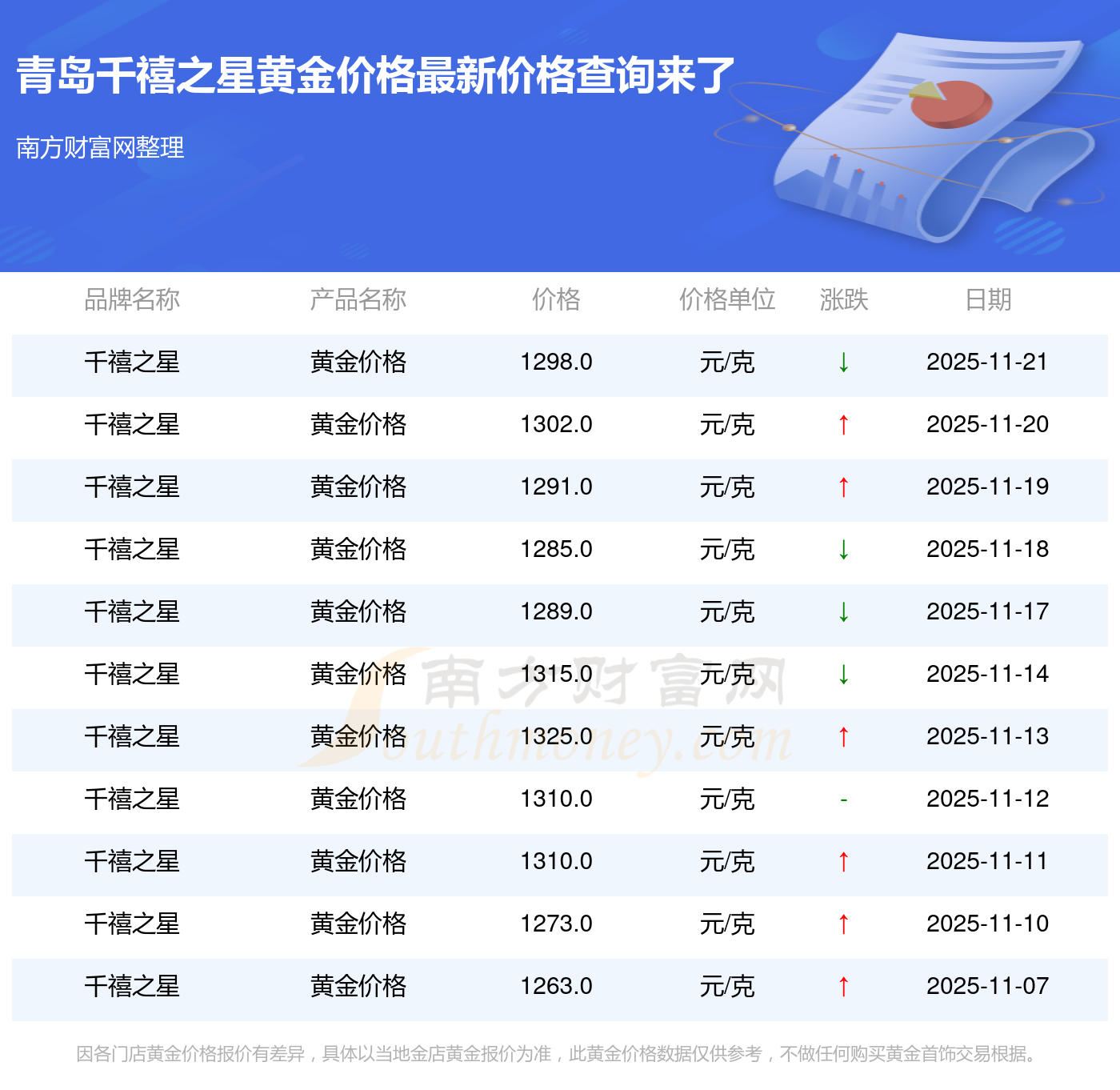 今日(2025年11月22日),青岛千禧之星黄金价格的价格是1298.0元/克。