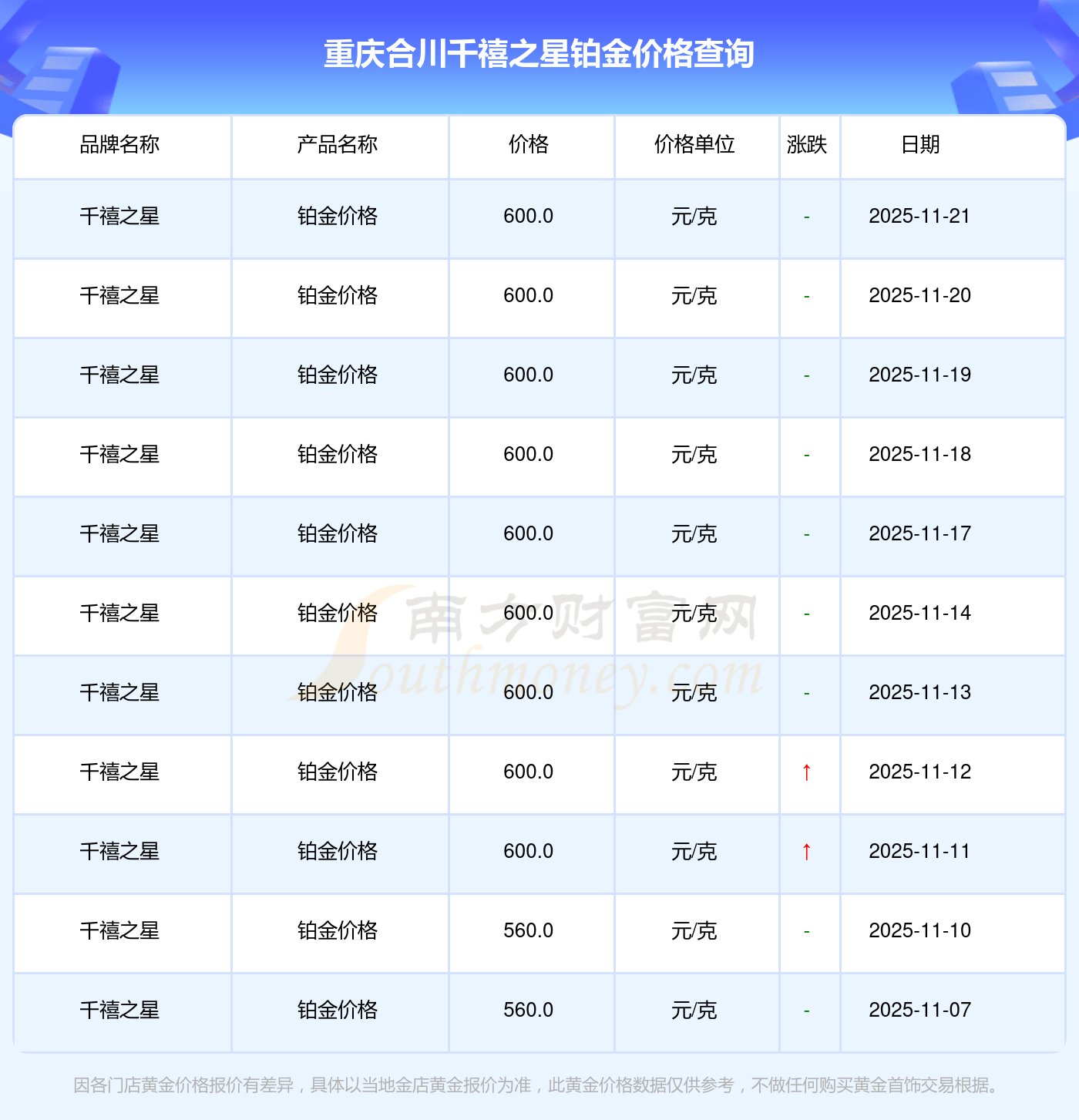 2025年11月22日,周大福、周大福、周大福、周大福、周大福、周大福、周大福、老凤祥、老凤祥、老凤祥、周六福等各大金店品牌铂金价格今日价格如下:周大福1305.0元/克、周大福616.0元/克、周大福1305.0元/克、周大福45110.0、周大福17570.0、周大福40690.0、周大福1143.0元/克、老凤祥1298.0元/克、老凤祥600.0元/克、老凤祥1298.0元/克、周六福1266.0元/克。
