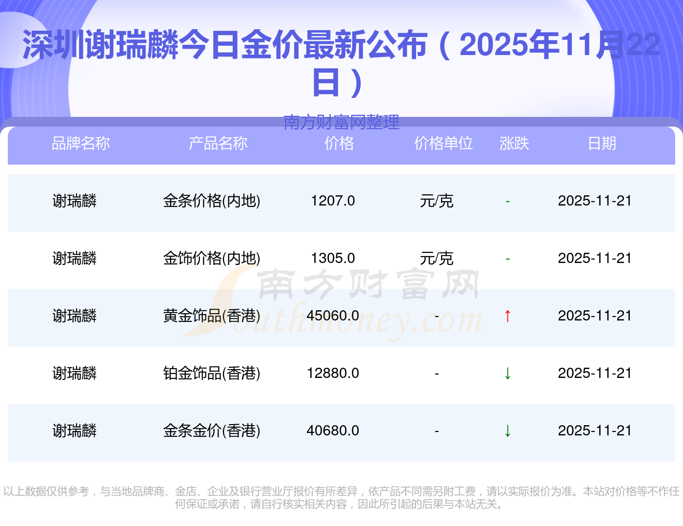 2025年11月22日深圳谢瑞麟黄金一克的市场行情价是多少?黄金价格1305.0元/克,铂金价格616.0元/克,饰品金价(内地)1305.0元/克,黄金饰品(香港)45110.0,铂金价格(香港)17570.0,金条价格(香港)40690.0,金条金价(内地)1143.0元/克,黄金价格1298.0元/克,铂金价格600.0元/克,足金价格1298.0元/克,黄金价格1266.0元/克。