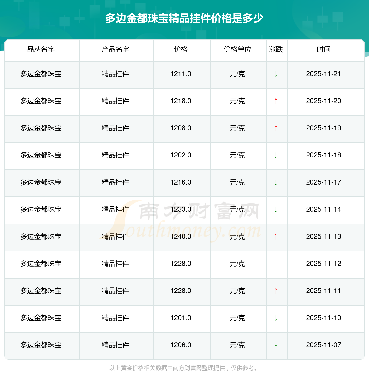 今日多边金都珠宝精品挂件价格是1211.0元/克。