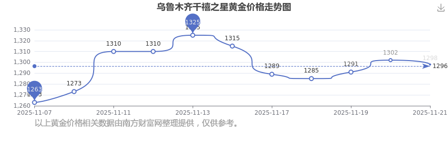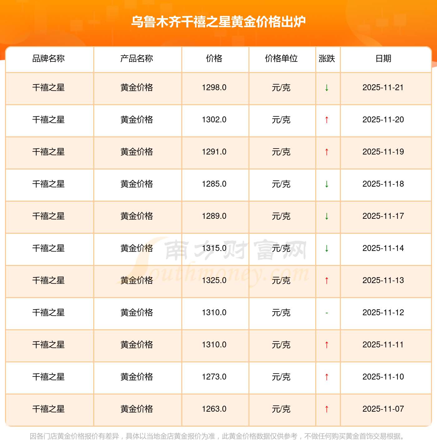 2025年11月22日当天,乌鲁木齐千禧之星黄金价格的单价是 1298.0元/克。