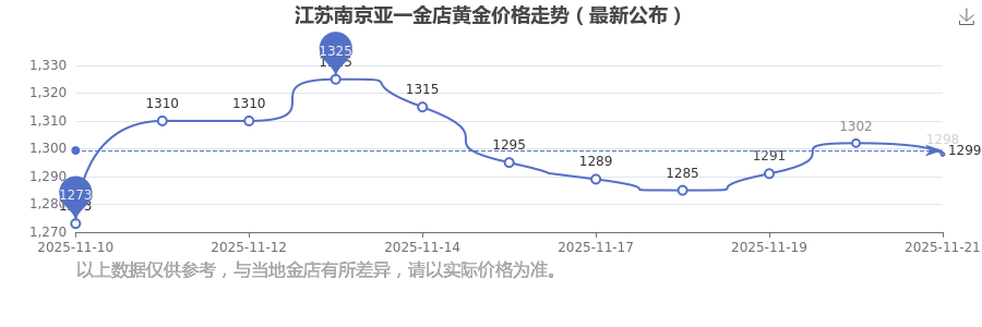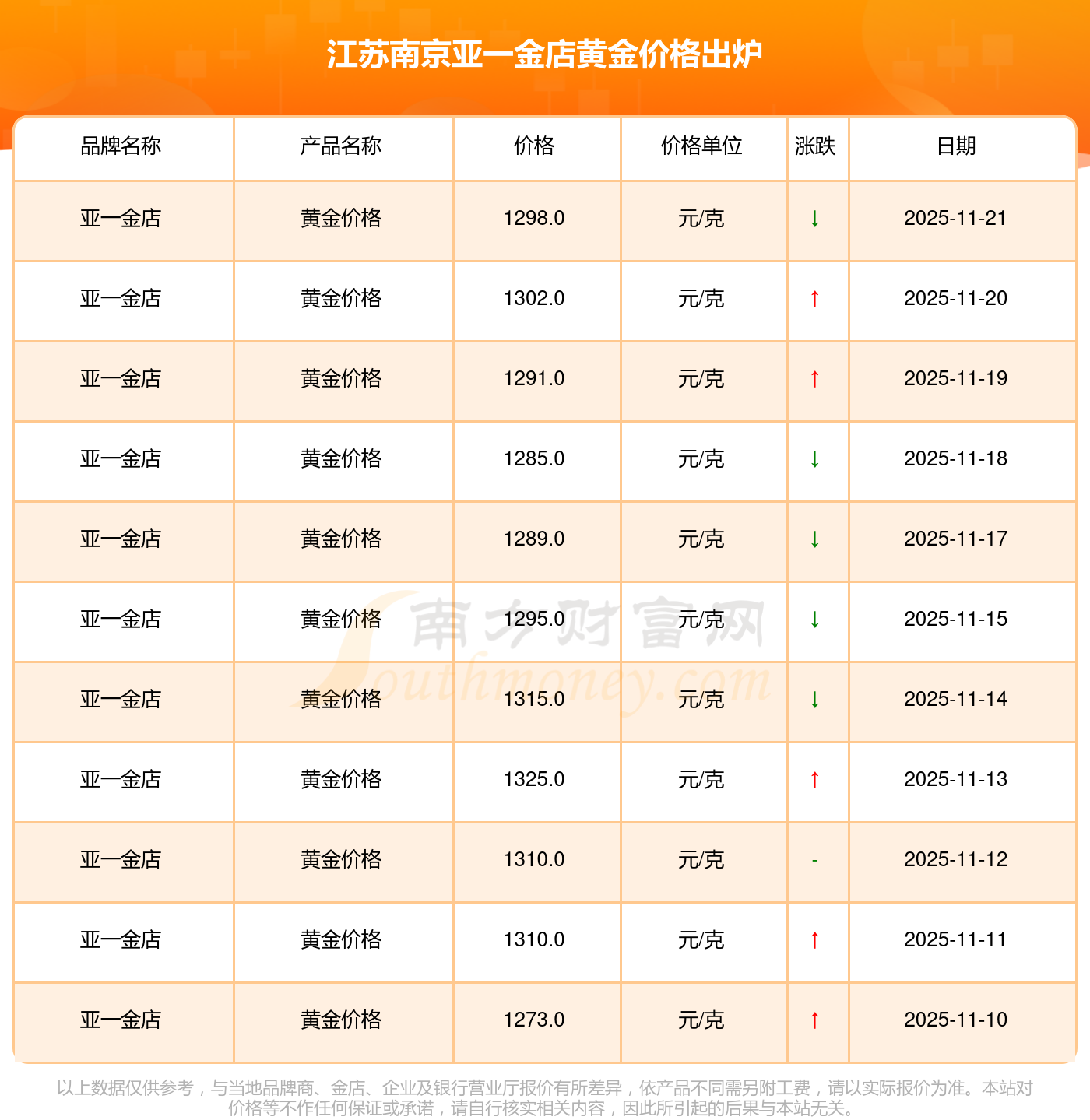 2025年11月22日江苏南京亚一金店黄金价格是1298.0元/克。