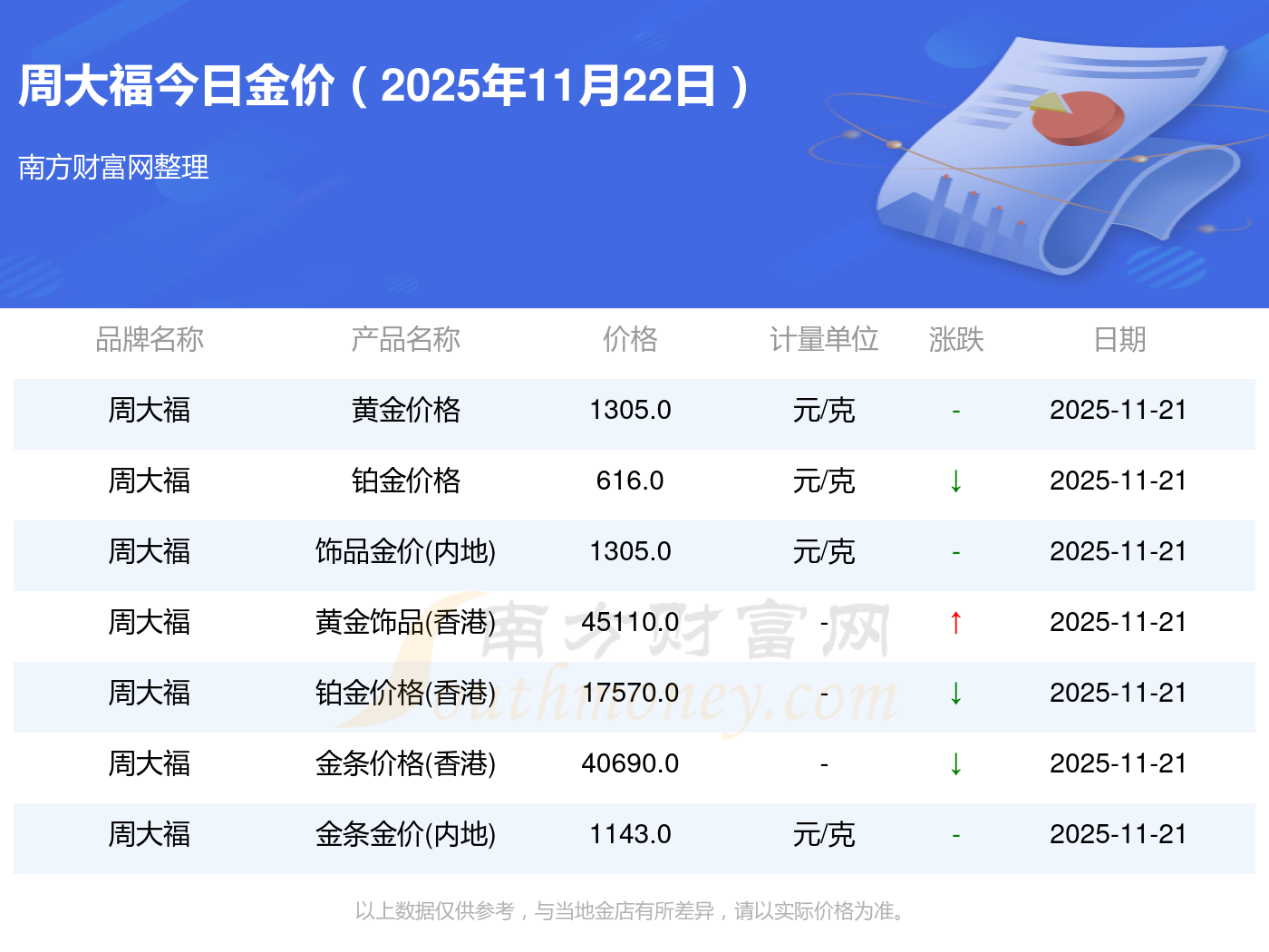 2025年11月22日,周大福、周大福、周大福、周大福、周大福、周大福、周大福、老凤祥、老凤祥、老凤祥、周六福等各大金店品牌黄金价格今日价格如下:周大福1305.0元/克、周大福616.0元/克、周大福1305.0元/克、周大福45110.0、周大福17570.0、周大福40690.0、周大福1143.0元/克、老凤祥1298.0元/克、老凤祥600.0元/克、老凤祥1298.0元/克、周六福1266.0元/克。
