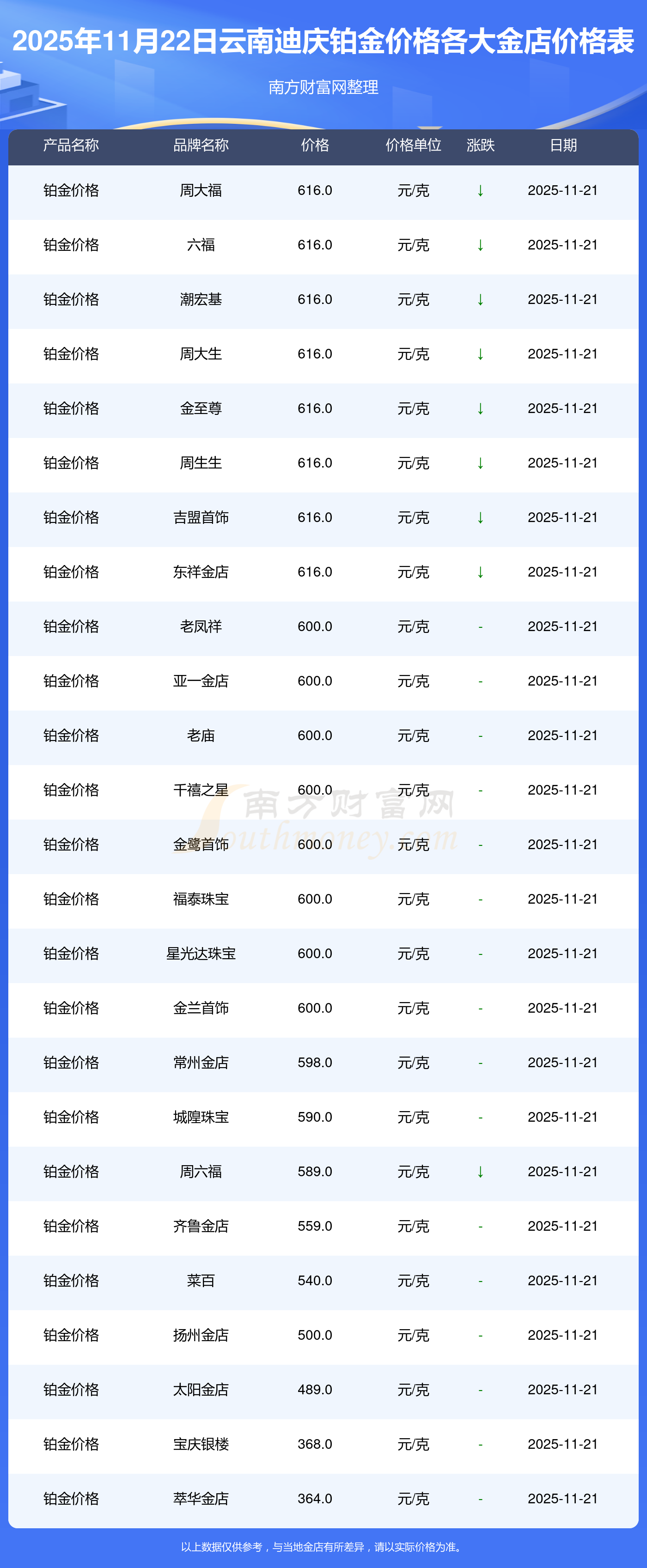 2025年11月22日云南迪庆周大福、周大福、周大福、周大福、周大福、周大福、周大福、老凤祥、老凤祥、老凤祥、周六福等各大金店品牌铂金价格最新价格行情来了,如下:周大福黄金价格1305.0元/克,周大福铂金价格616.0元/克,周大福饰品金价(内地)1305.0元/克,周大福黄金饰品(香港)45110.0,周大福铂金价格(香港)17570.0,周大福金条价格(香港)40690.0,周大福金条金价(内地)1143.0元/克,老凤祥黄金价格1298.0元/克,老凤祥铂金价格600.0元/克,老凤祥足金价格1298.0元/克,周六福黄金价格1266.0元/克。