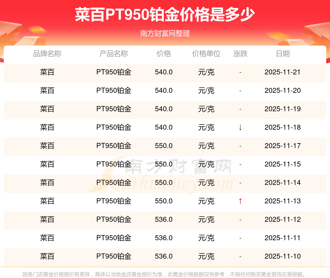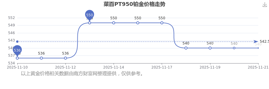 今日菜百PT950铂金价格最新查询:540.0元/克。