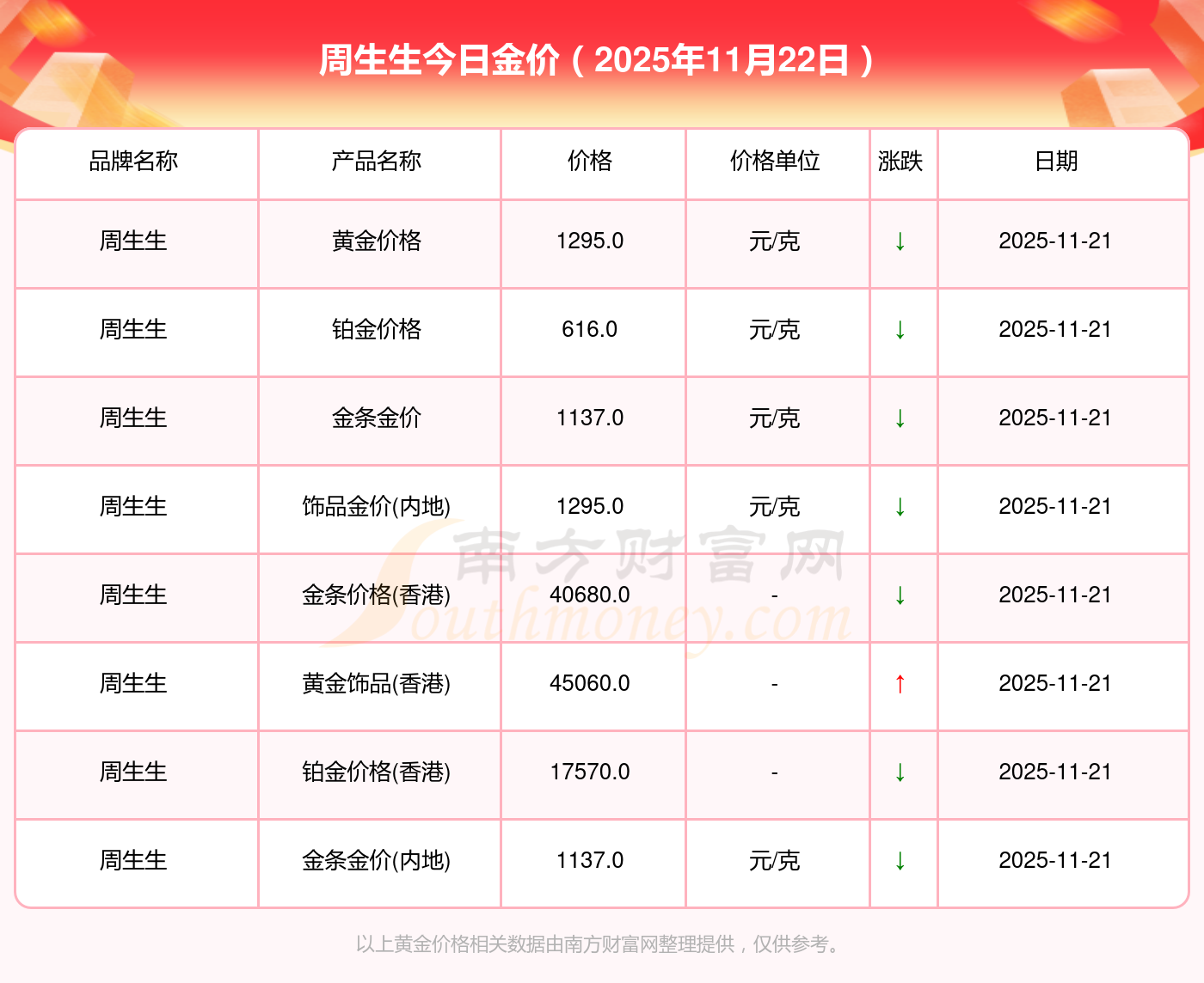 黄金价格1305.0元/克,铂金价格616.0元/克,饰品金价(内地)1305.0元/克,黄金饰品(香港)45110.0,铂金价格(香港)17570.0,金条价格(香港)40690.0,金条金价(内地)1143.0元/克,黄金价格1298.0元/克,铂金价格600.0元/克,足金价格1298.0元/克,黄金价格1266.0元/克。