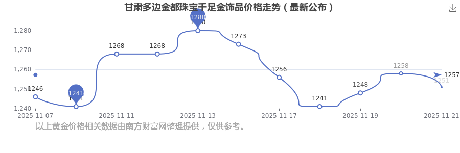 甘肃多边金都珠宝在 2025年11月22日的千足金饰品零售价格为 1251.0元/克。